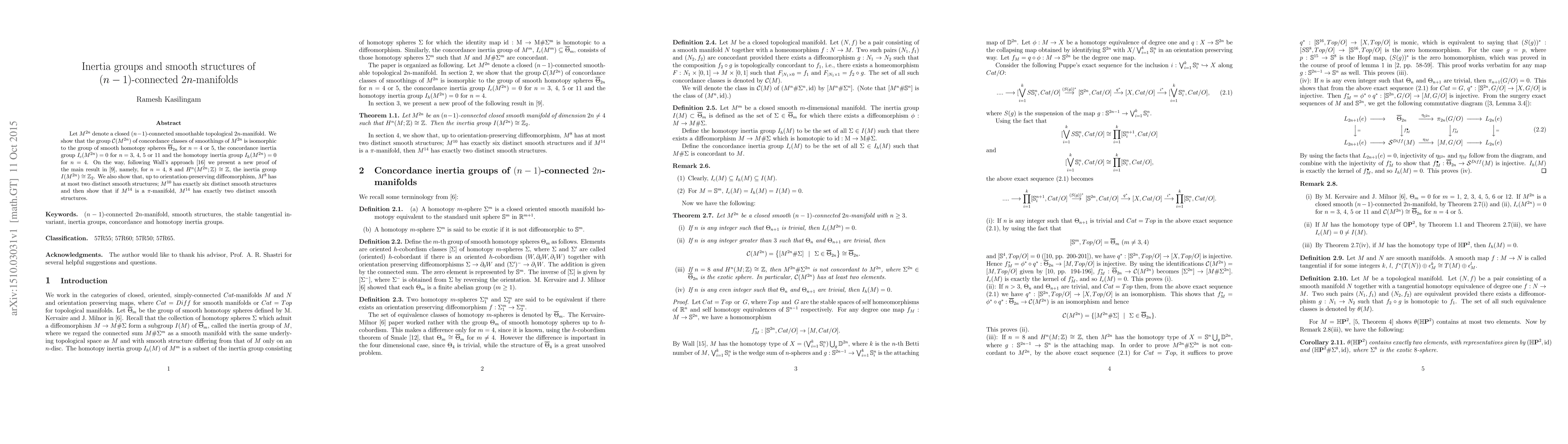 This paper investigates the smooth structures of $(n-1)$-connected $2n$-manifolds, demonstrating that for $n=4$ or $5$, the concordance classes of smoothings of $M^{2n}$ are isomorphic to the group of smooth homotopy spheres. It also shows that the inertia groups vanish for $n=3,4,5,$ or $11$ and provides new proofs for specific inertia group results.