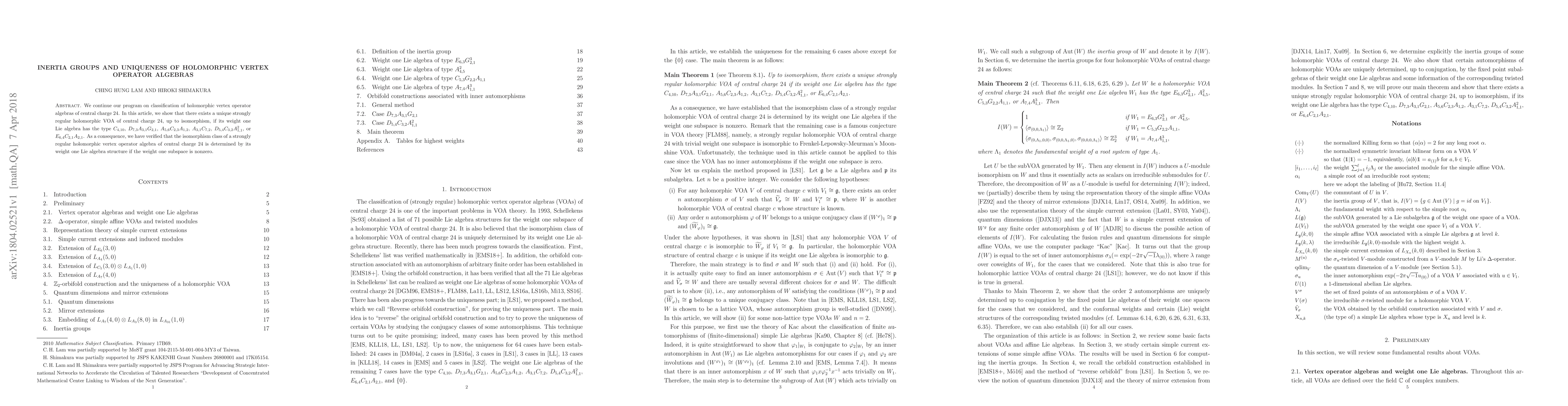 We continue our program on classification of holomorphic vertex operator algebras of central charge $24$. In this article, we show that there exists a unique strongly regular holomorphic VOA of central charge $24$, up to isomorphism, if its weight one Lie algebra has the type $C_{4,10}$, $D_{7,3}A_{3,1}G_{2,1}$, $A_{5,6}C_{2,3}A_{1,2}$, $A_{3,1}C_{7,2}$, $D_{5,4}C_{3,2}A_{1,1}^2$, or $E_{6,4}C_{2,1}A_{2,1}$. As a consequence, we have verified that the isomorphism class of a strongly regular holomorphic vertex operator algebra of central charge $24$ is determined by its weight one Lie algebra structure if the weight one subspace is nonzero.