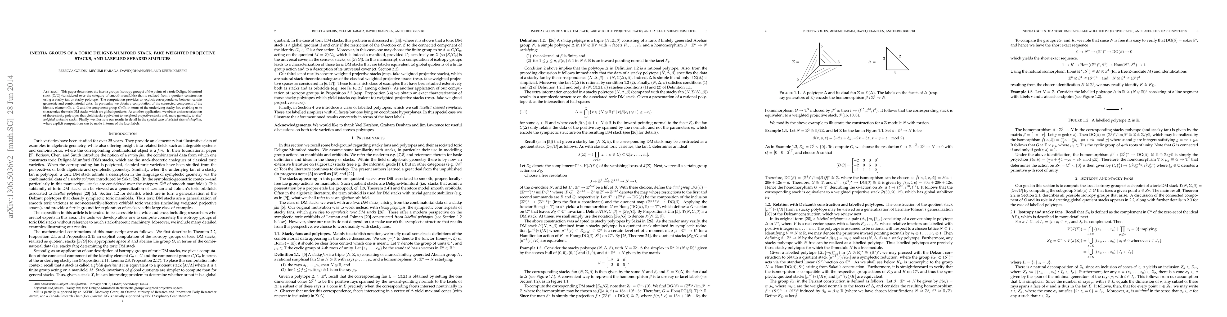 This paper determines the inertia groups (isotropy groups) of the points of a toric Deligne-Mumford stack [Z/G] (considered over the category of smooth manifolds) that is realized from a quotient construction using a stacky fan or stacky polytope. The computation provides an explicit correspondence between certain geometric and combinatorial data. In particular, we obtain a computation of the connected component of the identity element $G_0 \subset G$ and the component group $G/G_0$ in terms of the underlying stacky fan, enabling us to characterize the toric DM stacks which are global quotients. As another application, we obtain a characterization of those stacky polytopes that yield stacks equivalent to weighted projective stacks and, more generally, to `fake' weighted projective stacks. Finally, we illustrate our results in detail in the special case of labelled sheared simplices, where explicit computations can be made in terms of the facet labels.