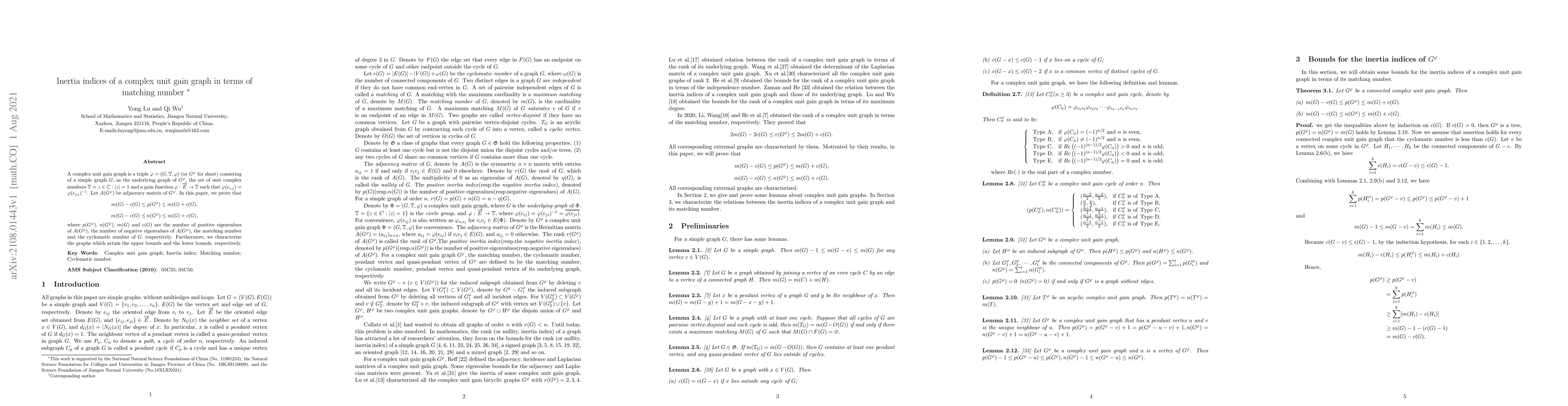 This paper investigates the inertia indices of complex unit gain graphs, proving bounds for the number of positive and negative eigenvalues in terms of the graph's matching number and cyclomatic number. It also characterizes graphs achieving these bounds.