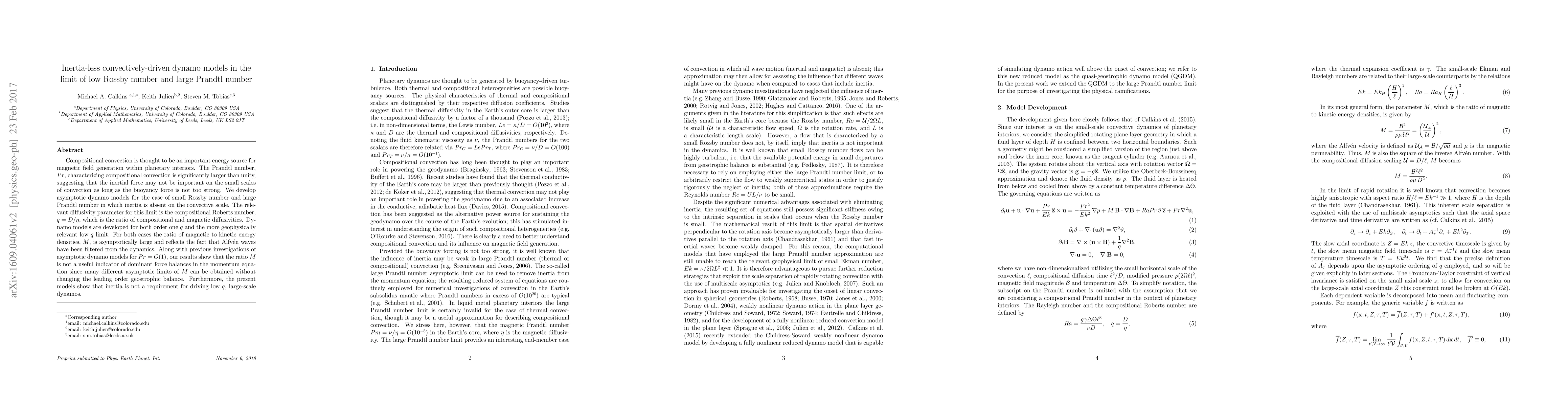 The research develops inertia-less dynamo models for low Rossby number and large Prandtl number, showing that inertia isn't necessary for driving low q, large-scale dynamos. It highlights that the magnetic to kinetic energy ratio (M) isn't a reliable indicator of force balances in the momentum equation across various asymptotic limits.