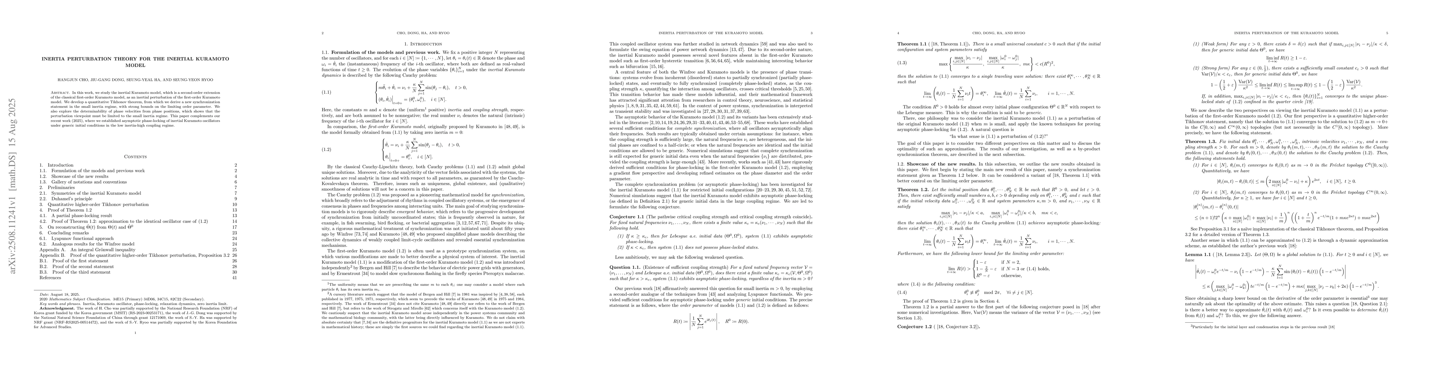 The research employs perturbation theory to analyze the inertial Kuramoto model, extending the classical first-order Kuramoto model by a second-order extension. A quantitative Tikhonov theorem is developed to derive synchronization statements, particularly in the small inertia regime with strong bounds on the limiting order parameter.