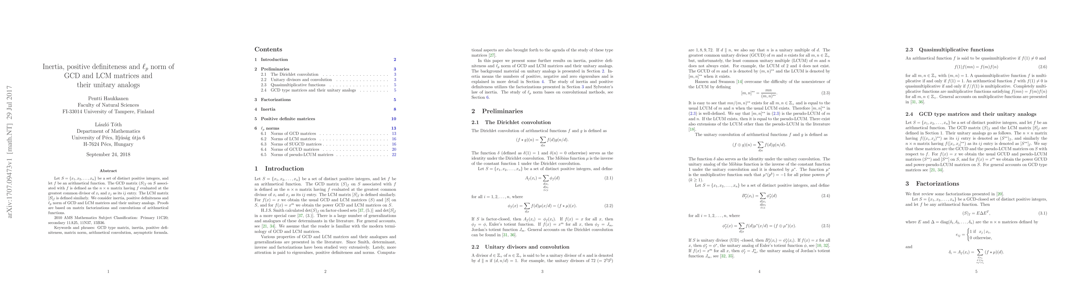 Let $S=\{x_1,x_2,\dots,x_n\}$ be a set of distinct positive integers, and let $f$ be an arithmetical function. The GCD matrix $(S)_f$ on $S$ associated with $f$ is defined as the $n\times n$ matrix having $f$ evaluated at the greatest common divisor of $x_i$ and $x_j$ as its $ij$ entry. The LCM matrix $[S]_f$ is defined similarly. We consider inertia, positive definiteness and $\ell_p$ norm of GCD and LCM matrices and their unitary analogs. Proofs are based on matrix factorizations and convolutions of arithmetical functions.