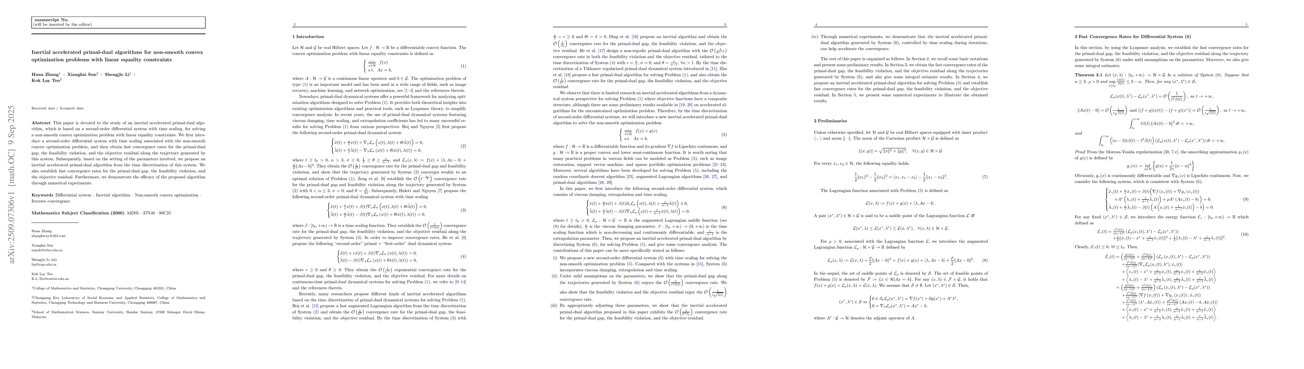 This paper is devoted to the study of an inertial accelerated primal-dual algorithm, which is based on a second-order differential system with time scaling, for solving a non-smooth convex optimization problem with linear equality constraints. We first introduce a second-order differential system with time scaling associated with the non-smooth convex optimization problem, and then obtain fast convergence rates for the primal-dual gap, the feasibility violation, and the objective residual along the trajectory generated by this system. Subsequently, based on the setting of the parameters involved, we propose an inertial accelerated primal-dual algorithm from the time discretization of this system. We also establish fast convergence rates for the primal-dual gap, the feasibility violation, and the objective residual. Furthermore, we demonstrate the efficacy of the proposed algorithm through numerical experiments.