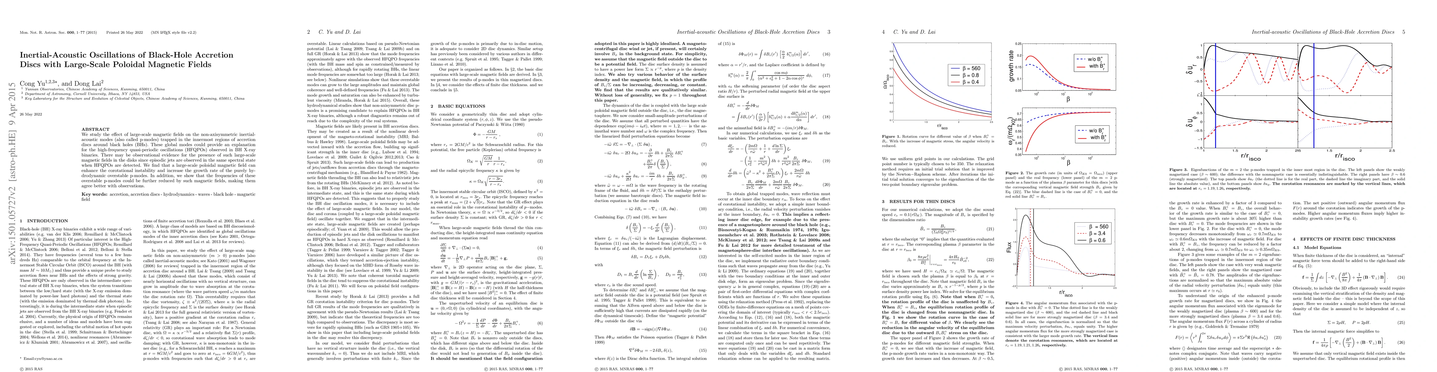 This paper investigates the impact of large-scale poloidal magnetic fields on inertial-acoustic oscillations in black-hole accretion discs, finding that these fields enhance the growth rate and modify the frequencies of non-axisymmetric p-modes, potentially explaining high-frequency quasi-periodic oscillations in X-ray binaries.