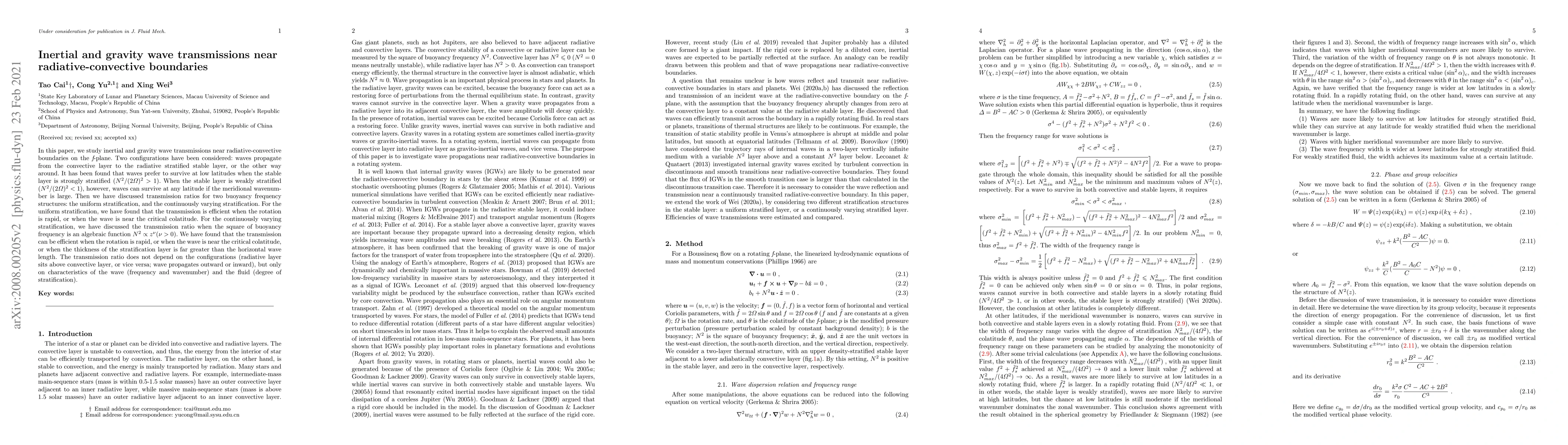 This paper investigates the transmission of inertial and gravity waves across radiative-convective boundaries on the f-plane, finding that wave survival depends on the stratification of the stable layer and the wave's meridional wavenumber. Efficient transmission occurs under rapid rotation, near critical colatitude, or when the stratification layer's thickness is much larger than the wave's horizontal length.