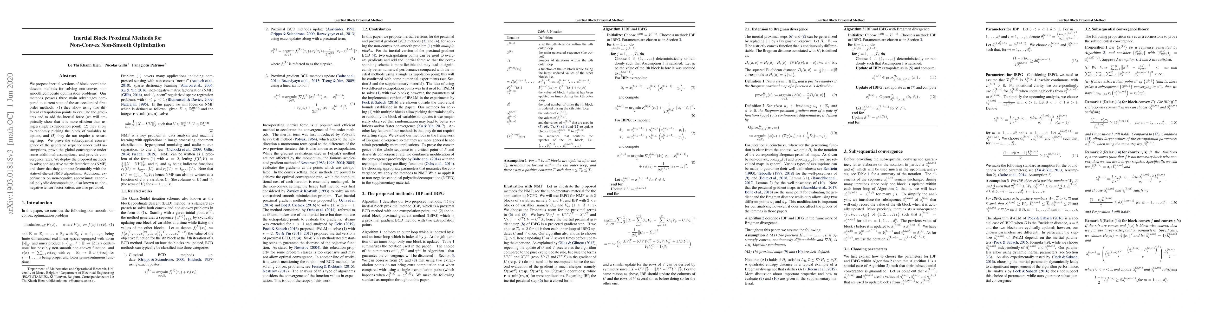 This paper introduces inertial block coordinate descent methods for non-convex non-smooth optimization, offering advantages like dual extrapolation points and random block selection without restarting. The authors demonstrate convergence and competitive performance in solving non-negative matrix factorization and tensor factorization problems.