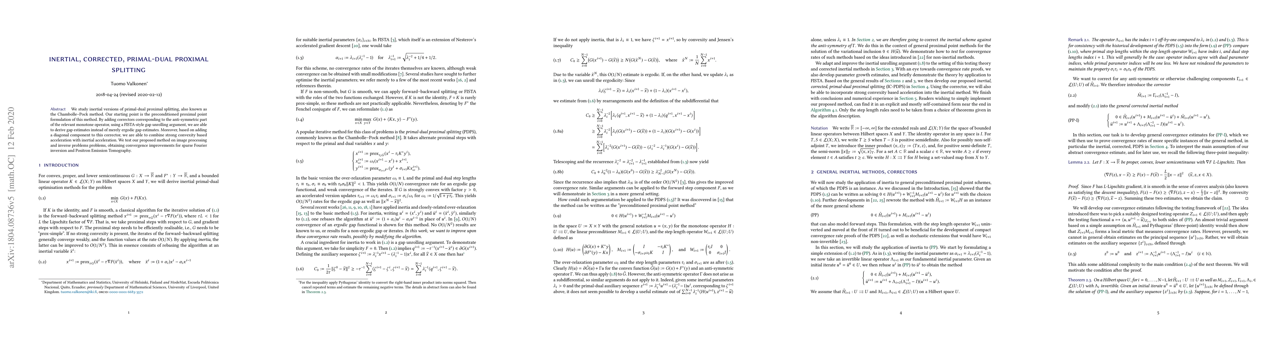 This paper proposes an inertial, corrected version of the primal-dual proximal splitting method, enhancing its convergence through the addition of correctors and a diagonal component. The method achieves improved convergence in image processing and inverse problems, particularly in sparse Fourier inversion and Positron Emission Tomography.