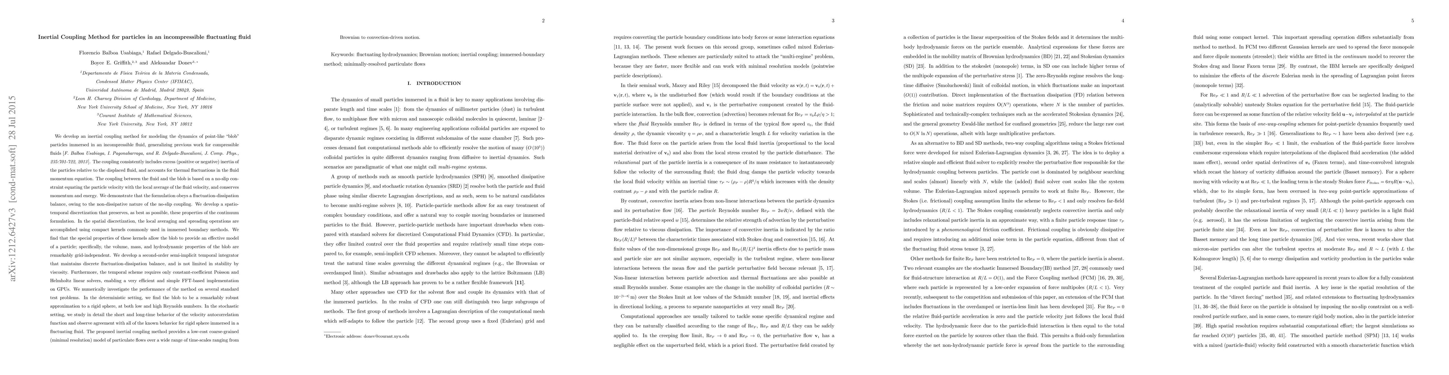 We develop an inertial coupling method for modeling the dynamics of point-like 'blob' particles immersed in an incompressible fluid, generalizing previous work for compressible fluids. The coupling consistently includes excess (positive or negative) inertia of the particles relative to the displaced fluid, and accounts for thermal fluctuations in the fluid momentum equation. The coupling between the fluid and the blob is based on a no-slip constraint equating the particle velocity with the local average of the fluid velocity, and conserves momentum and energy. We demonstrate that the formulation obeys a fluctuation-dissipation balance, owing to the non-dissipative nature of the no-slip coupling. We develop a spatio-temporal discretization that preserves, as best as possible, these properties of the continuum formulation. In the spatial discretization, the local averaging and spreading operations are accomplished using compact kernels commonly used in immersed boundary methods. We find that the special properties of these kernels make the discrete blob a particle with surprisingly physically-consistent volume, mass, and hydrodynamic properties. We develop a second-order semi-implicit temporal integrator that maintains discrete fluctuation-dissipation balance, and is not limited in stability by viscosity. Furthermore, the temporal scheme requires only constant-coefficient Poisson and Helmholtz linear solvers, enabling a very efficient and simple FFT-based implementation on GPUs. We numerically investigate the performance of the method on several standard test problems...