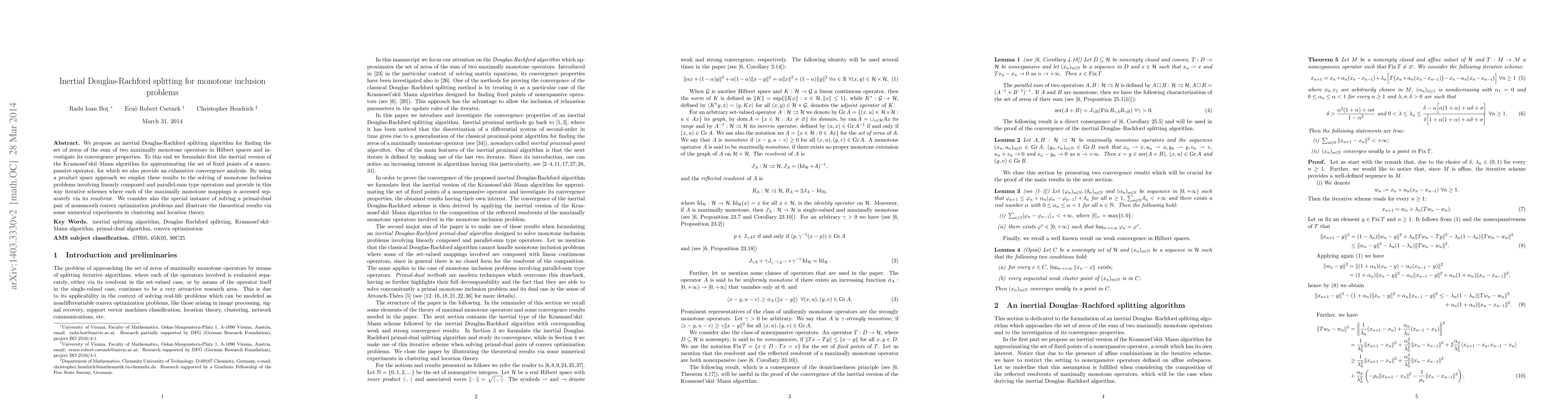 This paper proposes an inertial Douglas-Rachford splitting algorithm for solving monotone inclusion problems in Hilbert spaces, analyzing its convergence properties. The authors also develop an inertial version of the Krasnosel'skii-Mann algorithm and provide numerical experiments to demonstrate its effectiveness in clustering and location theory.