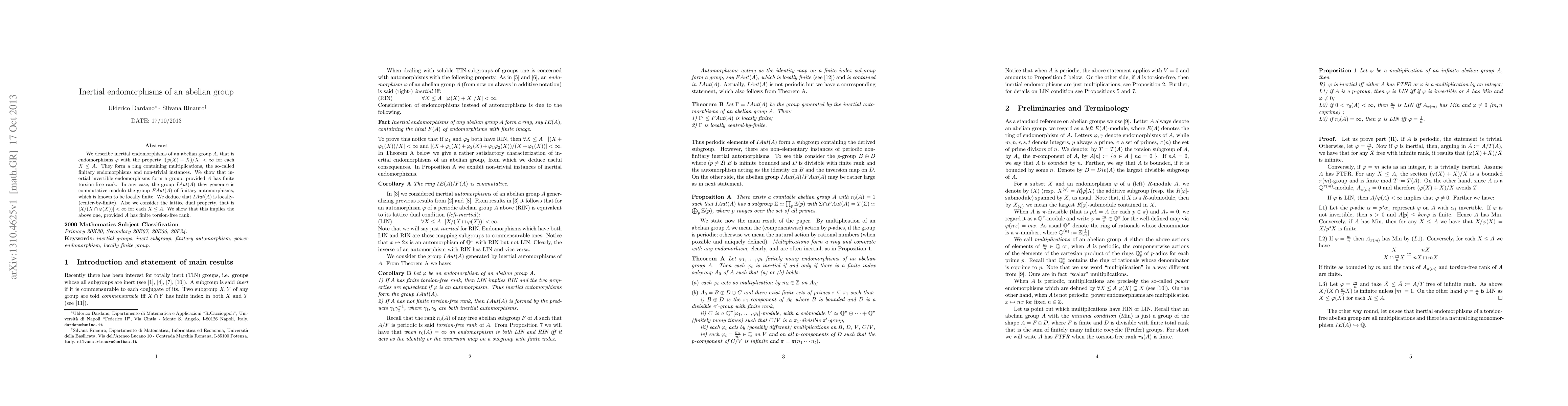 This paper investigates inertial endomorphisms of an abelian group $A$, which are endomorphisms $\varphi$ satisfying $|(\varphi(X)+X)/X|<\infty$ for each subgroup $X\le A$. It demonstrates that inertial invertible endomorphisms form a group when $A$ has finite torsion-free rank, and that $IAut(A)$ is commutative modulo the locally finite group $FAut(A)$ of finitary automorphisms.