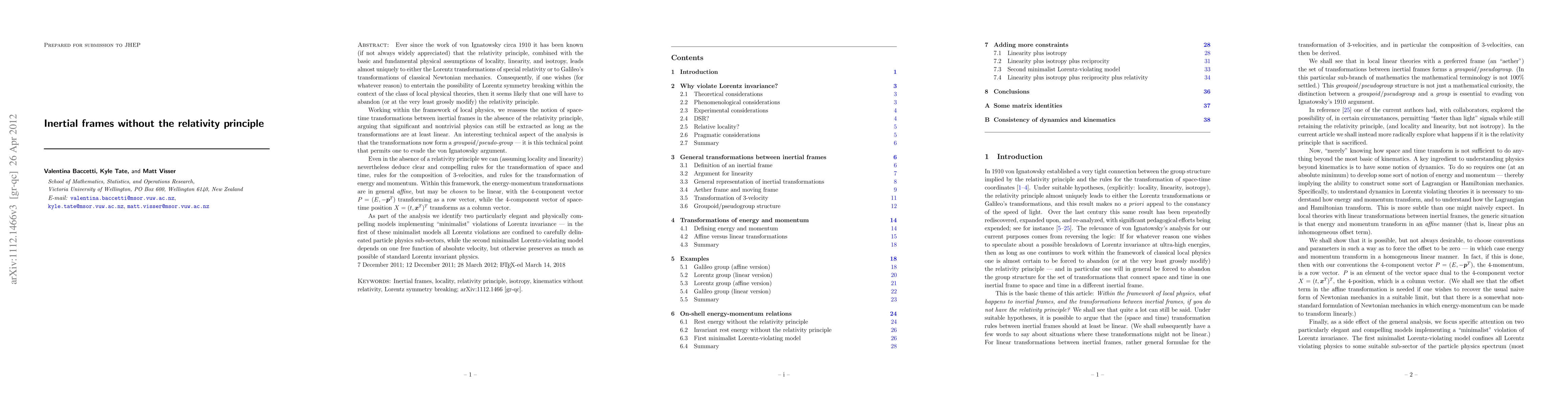 This paper explores inertial frames without relying on the relativity principle, demonstrating that linear transformations can still yield meaningful physical rules, even when the relativity principle is abandoned. It identifies two minimalist models that minimally violate Lorentz invariance, providing a framework for studying potential Lorentz symmetry breaking in local physical theories.