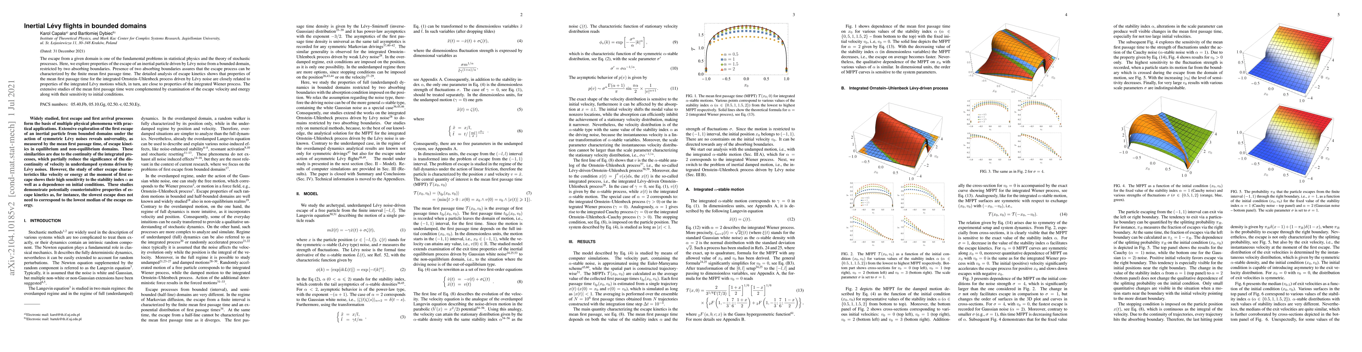 The escape from a given domain is one of the fundamental problems in statistical physics and the theory of stochastic processes. Here, we explore properties of the escape of an inertial particle driven by L\'evy noise from a bounded domain, restricted by two absorbing boundaries.Presence of two absorbing boundaries assures that the escape process can be characterized by the finite mean first passage time. The detailed analysis of escape kinetics shows that properties of the mean first passage time for the integrated Ornstein--Uhlenbeck process driven by L\'evy noise are closely related to properties of the integrated L\'evy motions which, in turn, are close to properties of the integrated Wiener process. The extensive studies of the mean first passage time were complemented by examination of the escape velocity and energy along with their sensitivity to initial conditions.