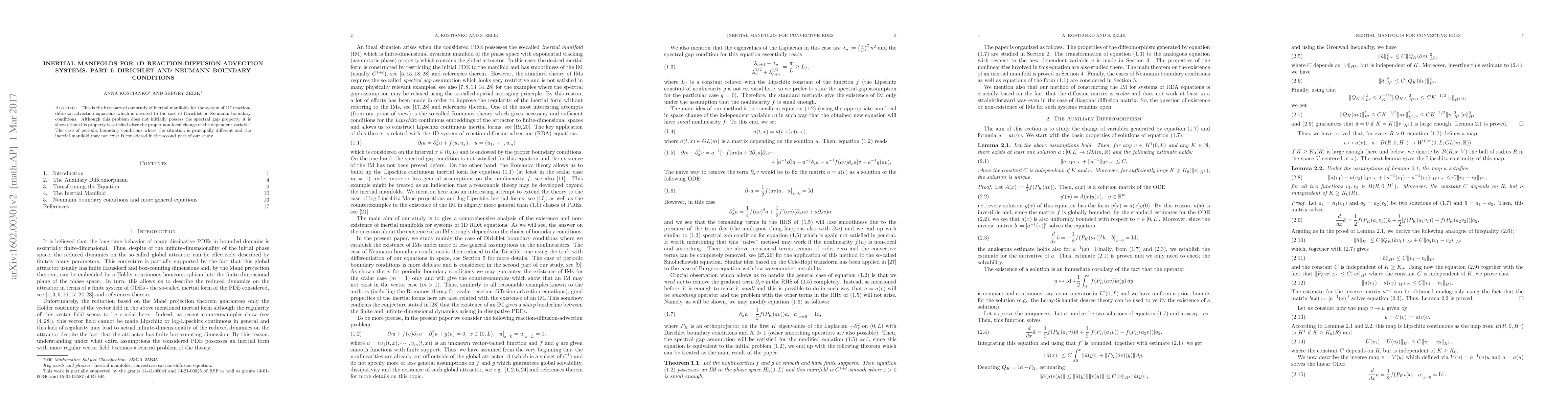 This paper investigates inertial manifolds for 1D reaction-diffusion-advection systems under Dirichlet and Neumann boundary conditions, demonstrating the emergence of a spectral gap after a suitable variable transformation. The second part will address the case with periodic boundary conditions.