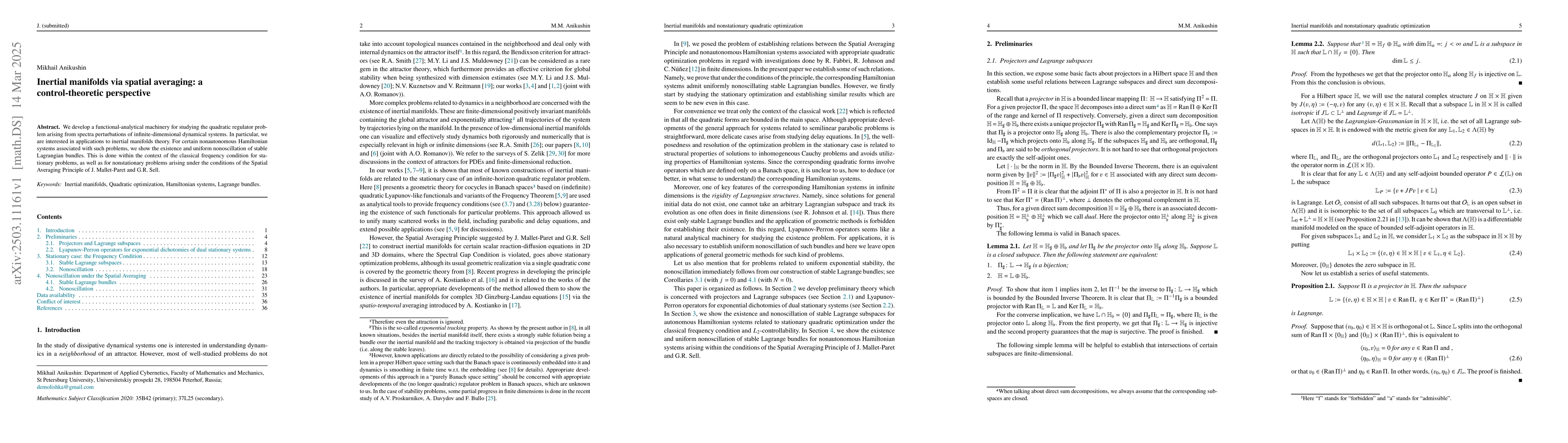 The research introduces a control-theoretic perspective on inertial manifolds, linking spectral perturbations, stable Lagrangian bundles, and the Spatial Averaging Principle in a unified framework.