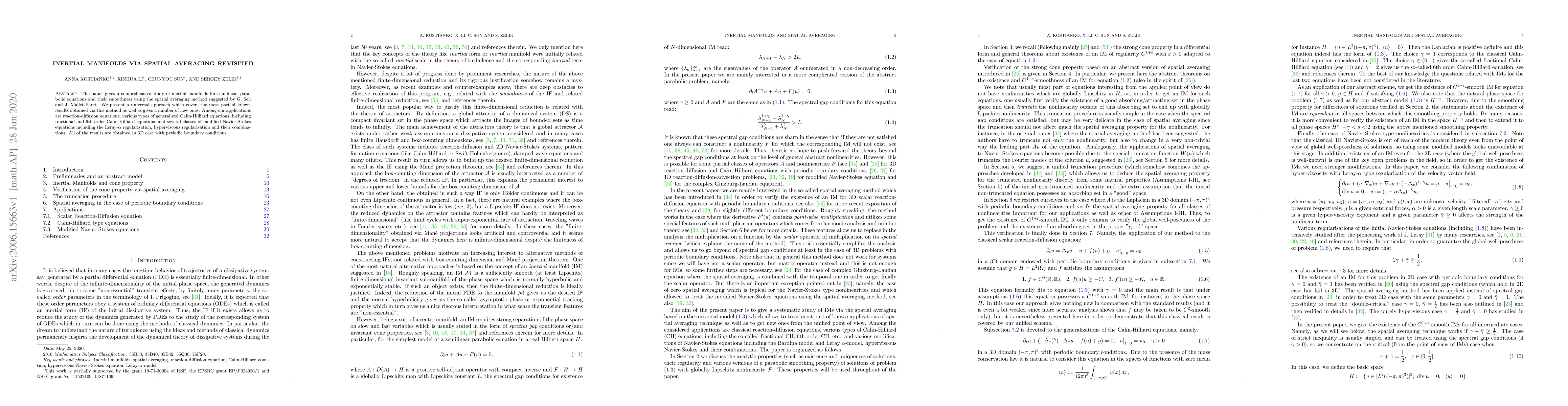 This paper revisits inertial manifolds for semilinear parabolic equations using spatial averaging, presenting a universal approach that encompasses existing results and introduces new findings. It applies this method to reaction-diffusion, Cahn-Hilliard, and modified Navier-Stokes equations in 3D with periodic boundary conditions.
