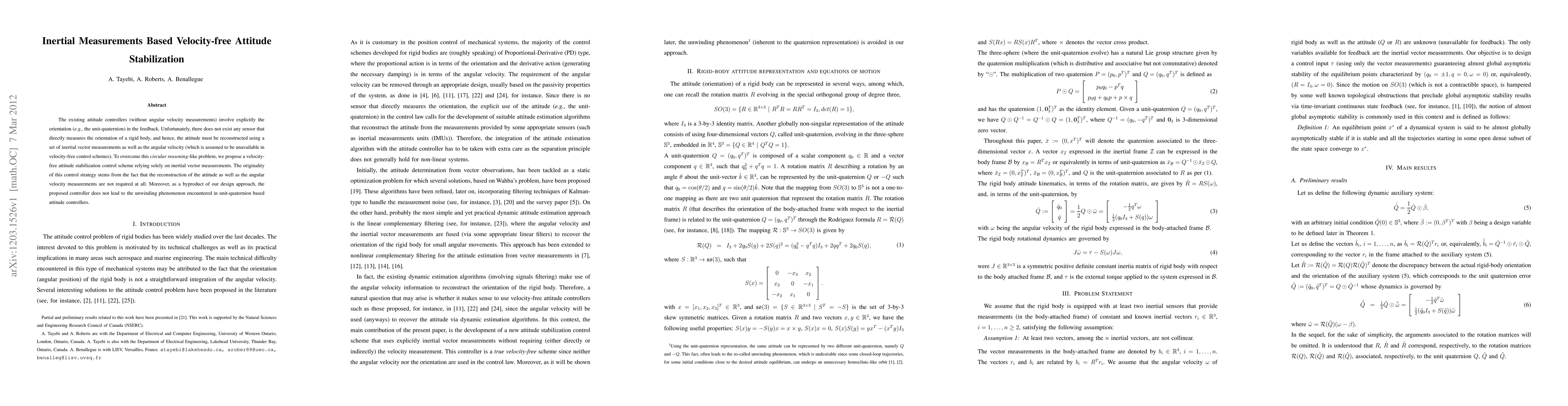 This paper proposes a novel velocity-free attitude stabilization control scheme that relies exclusively on inertial vector measurements without requiring angular velocity data or direct orientation reconstruction. The approach avoids the "circular reasoning" issue inherent in existing methods and eliminates the unwinding phenomenon typically seen in unit-quaternion based controllers.