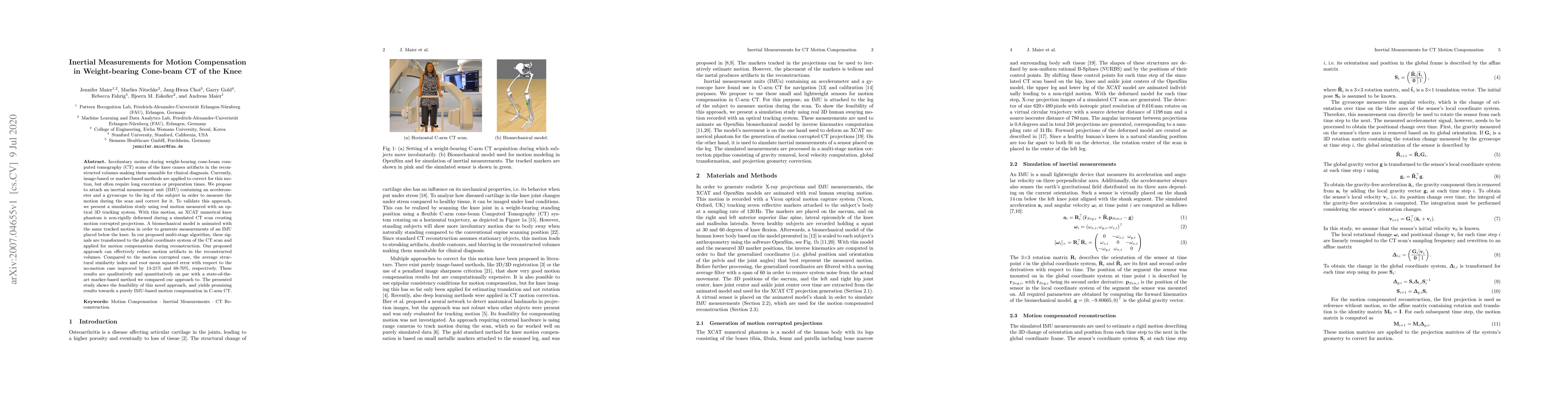 A novel approach to motion correction in weight-bearing cone-beam CT imaging using inertial sensors is presented.