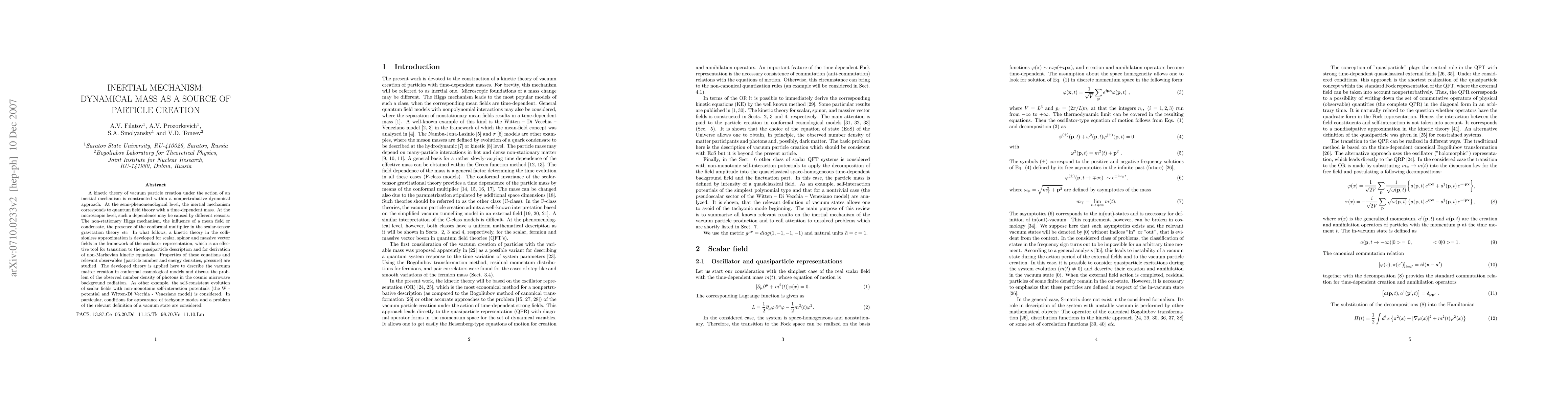 A kinetic theory of vacuum particle creation under the action of an inertial mechanism is constructed within a nonpertrubative dynamical approach. At the semi-phenomenological level, the inertial mechanism corresponds to quantum field theory with a time-dependent mass. At the microscopic level, such a dependence may be caused by different reasons: The non-stationary Higgs mechanism, the influence of a mean field or condensate, the presence of the conformal multiplier in the scalar-tensor gravitation theory etc. In what follows, a kinetic theory in the collisionless approximation is developed for scalar, spinor and massive vector fields in the framework of the oscillator representation, which is an effective tool for transition to the quasiparticle description and for derivation of non-Markovian kinetic equations. Properties of these equations and relevant observables (particle number and energy densities, pressure) are studied. The developed theory is applied here to describe the vacuum matter creation in conformal cosmological models and discuss the problem of the observed number density of photons in the cosmic microwave background radiation. As other example, the self-consistent evolution of scalar fields with non-monotonic self-interaction potentials (the W-potential and Witten - Di Vecchia - Veneziano model) is considered. In particular, conditions for appearance of tachyonic modes and a problem of the relevant definition of a vacuum state are considered.