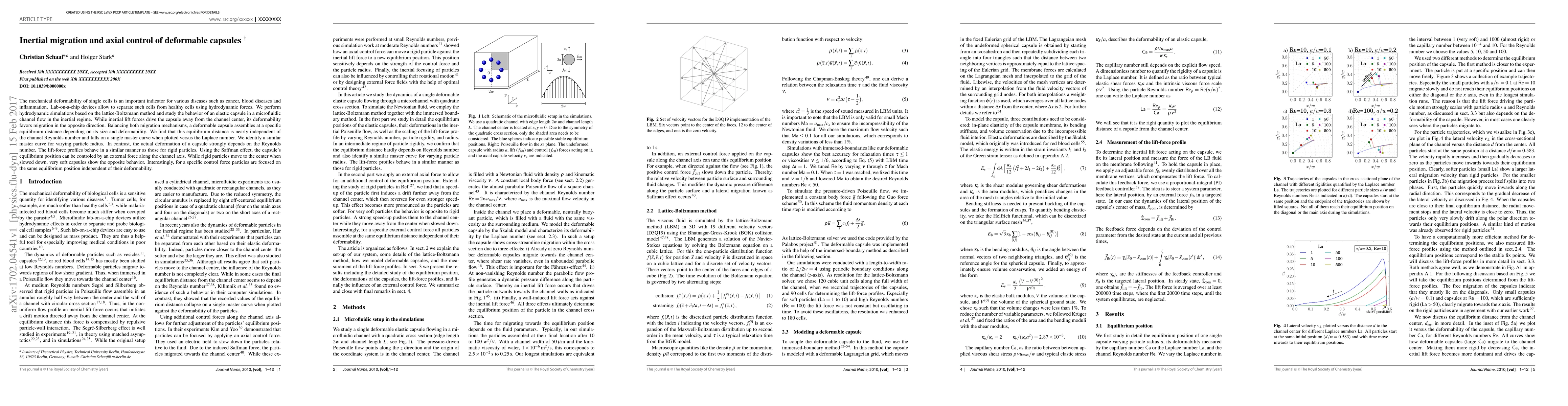 This study investigates the inertial migration and axial control of deformable capsules in microfluidic channels, revealing that their equilibrium position is nearly independent of the Reynolds number and follows a master curve based on the Laplace number. External forces can manipulate the capsule's position, with very soft capsules exhibiting opposite behavior to rigid particles, yet focusing at a common equilibrium point under specific control conditions.