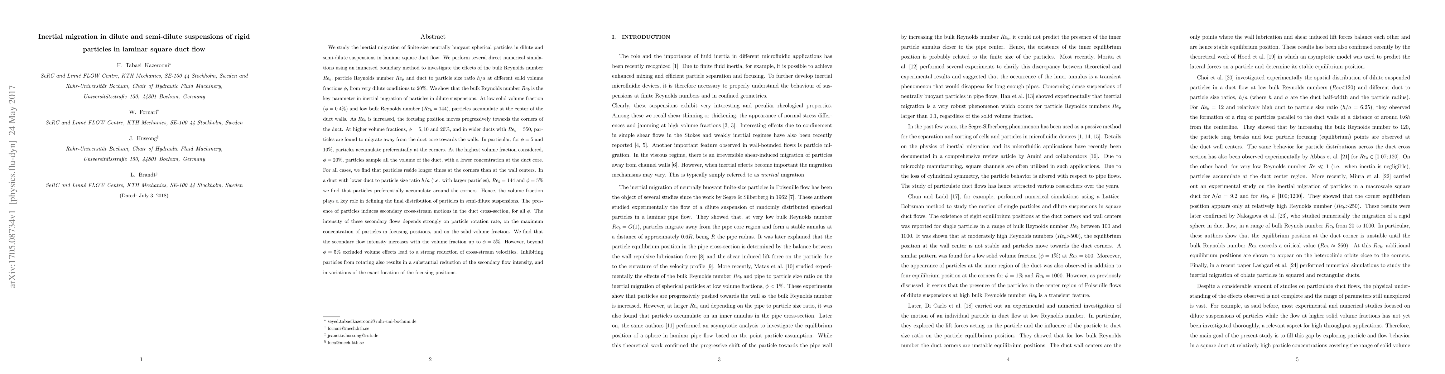 This study investigates the inertial migration of neutrally buoyant spherical particles in laminar square duct flow, revealing that the bulk Reynolds number $Re_b$ is crucial for migration in dilute suspensions. At higher solid volume fractions, particles migrate towards the duct walls and corners, inducing secondary cross-stream flows whose intensity diminishes beyond 5% volume fraction due to excluded volume effects.