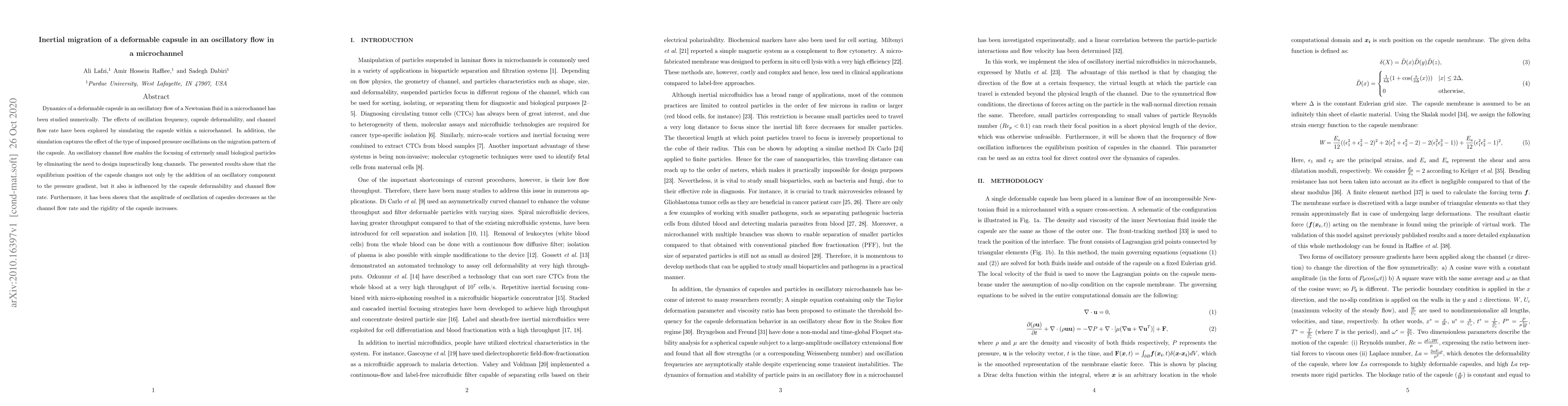 This paper numerically investigates the inertial migration of deformable capsules in oscillatory flow within microchannels, exploring the effects of oscillation frequency, capsule deformability, and channel flow rate. The study reveals that oscillatory flow can focus small particles without long channels, and the capsule's equilibrium position and oscillation amplitude are influenced by these factors.