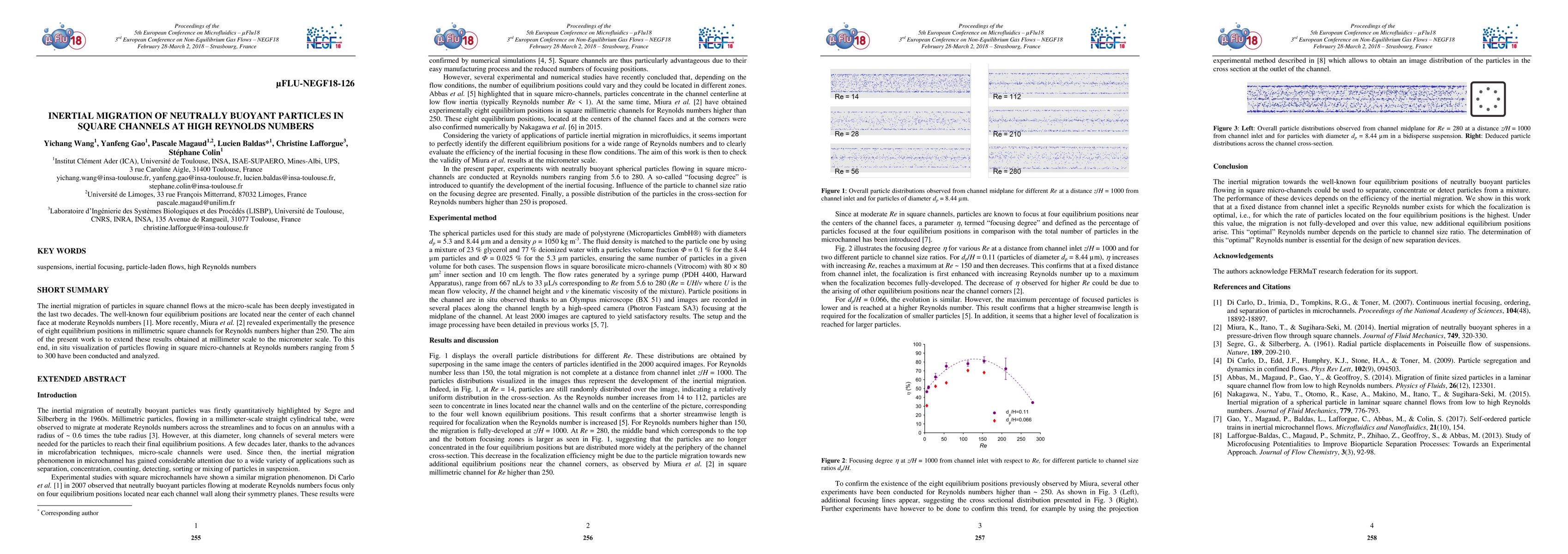 KEY WORDS suspensions, inertial focusing, particle-laden flows, high Reynolds numbers SHORT SUMMARY The inertial migration of particles in square channel flows at the micro-scale has been deeply investigated in the last two decades. The well-known four equilibrium positions are located near the center of each channel face at moderate Reynolds numbers [1]. More recently, Miura et al. [2] revealed experimentally the presence of eight equilibrium positions in millimetric square channels for Reynolds numbers higher than 250. The aim of the present work is to extend these results obtained at millimeter scale to the micrometer scale. To this end, in situ visualization of particles flowing in square micro-channels at Reynolds numbers ranging from 5 to 300 have been conducted and analyzed.