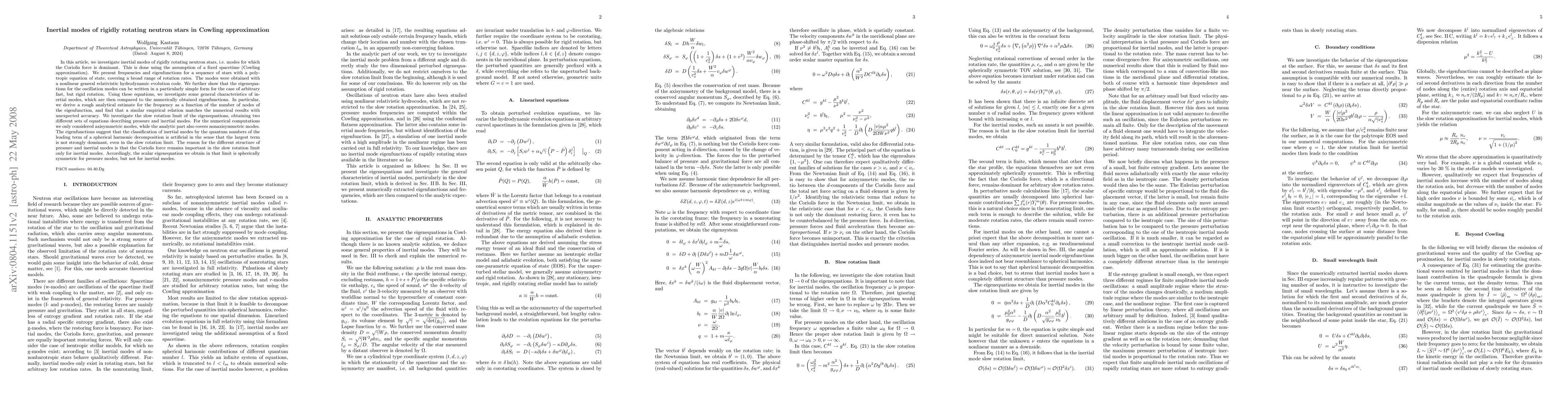 This paper investigates inertial modes in rigidly rotating neutron stars using the Cowling approximation, presenting frequencies and eigenfunctions for various rotation rates. It derives simple eigenequations for these modes and finds an empirical relation that closely matches numerical results, highlighting differences in pressure and inertial modes due to the Coriolis force's influence.