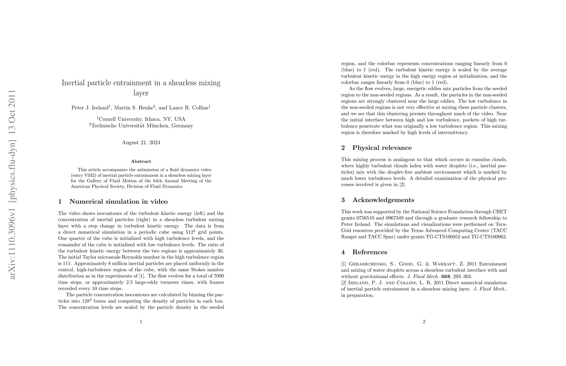 This article accompanies the submission of a fluid dynamics video (entry V032) of inertial particle entrainment in a shearless mixing layer for the Gallery of Fluid Motion of the 64th Annual Meeting of the American Physical Society, Division of Fluid Dynamics.