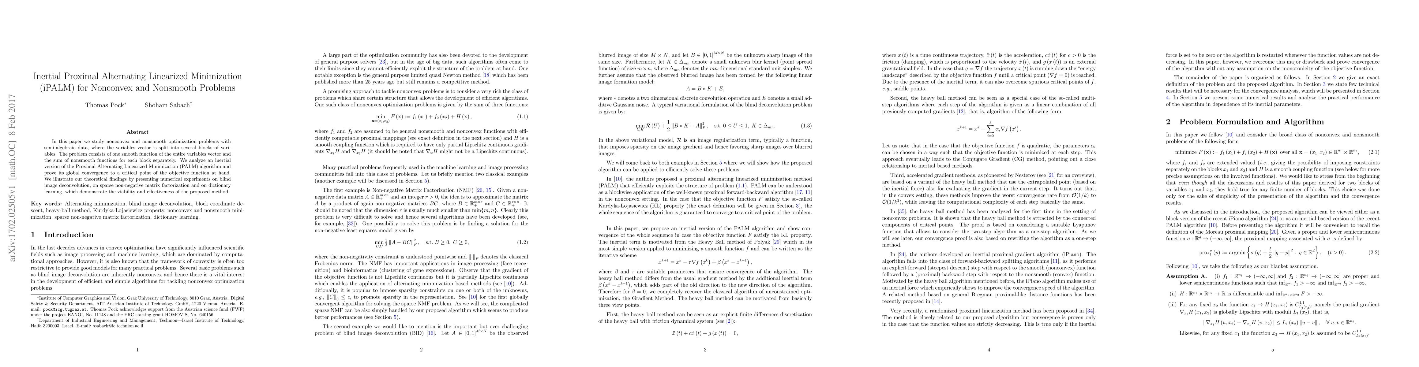 This paper proposes an inertial version of the Proximal Alternating Linearized Minimization (iPALM) algorithm for solving nonconvex and nonsmooth optimization problems with semi-algebraic data. The authors prove global convergence and demonstrate the method's effectiveness through numerical experiments in blind image deconvolution, sparse non-negative matrix factorization, and dictionary learning.
