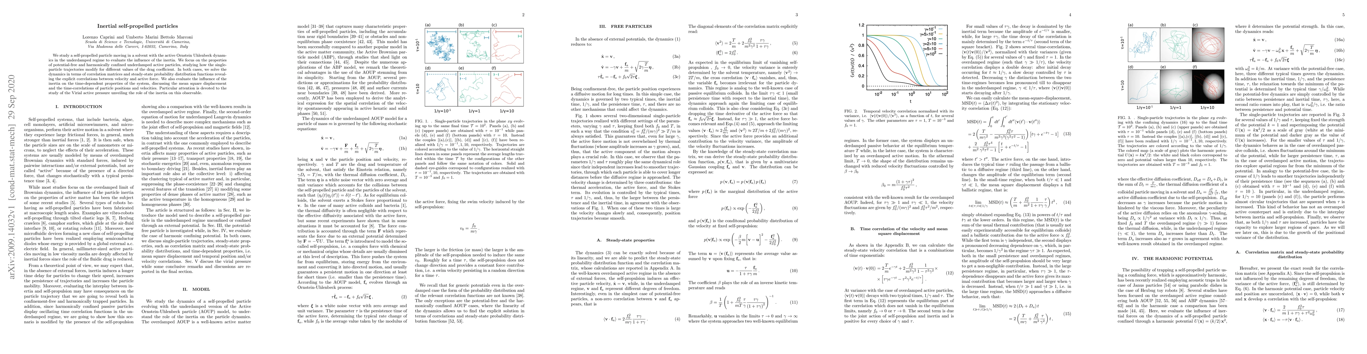 This paper investigates the dynamics of inertial self-propelled particles in a solvent, focusing on the influence of inertia on their trajectories under different drag coefficients. The study reveals correlations between velocity and active force, and examines the impact of inertia on mean square displacement and time-correlations, highlighting the role of inertia in the Virial active pressure.