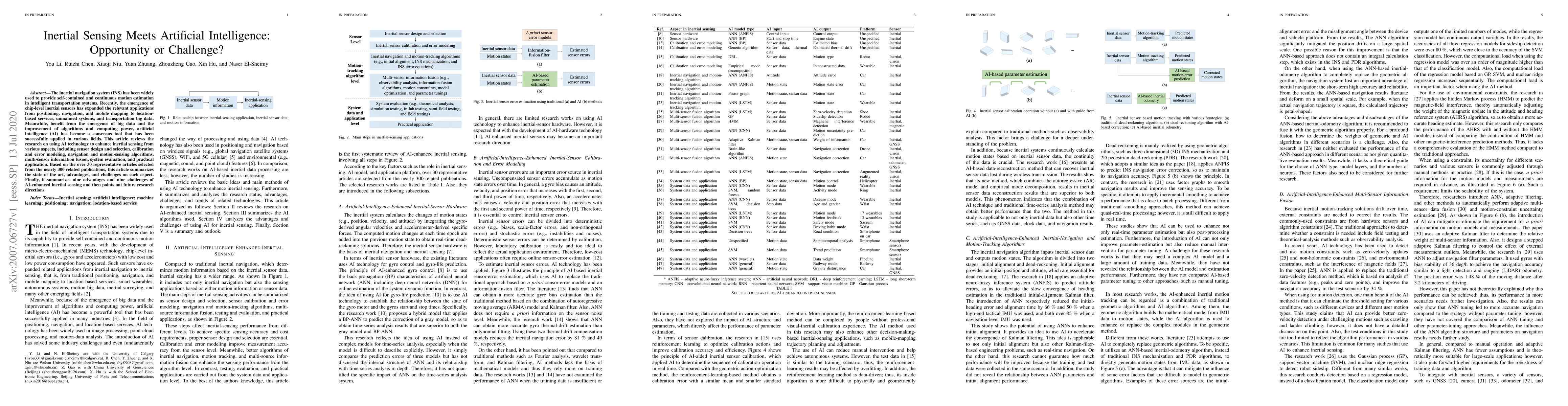 The inertial navigation system (INS) has been widely used to provide self-contained and continuous motion estimation in intelligent transportation systems. Recently, the emergence of chip-level inertial sensors has expanded the relevant applications from positioning, navigation, and mobile mapping to location-based services, unmanned systems, and transportation big data. Meanwhile, benefit from the emergence of big data and the improvement of algorithms and computing power, artificial intelligence (AI) has become a consensus tool that has been successfully applied in various fields. This article reviews the research on using AI technology to enhance inertial sensing from various aspects, including sensor design and selection, calibration and error modeling, navigation and motion-sensing algorithms, multi-sensor information fusion, system evaluation, and practical application. Based on the over 30 representative articles selected from the nearly 300 related publications, this article summarizes the state of the art, advantages, and challenges on each aspect. Finally, it summarizes nine advantages and nine challenges of AI-enhanced inertial sensing and then points out future research directions.
