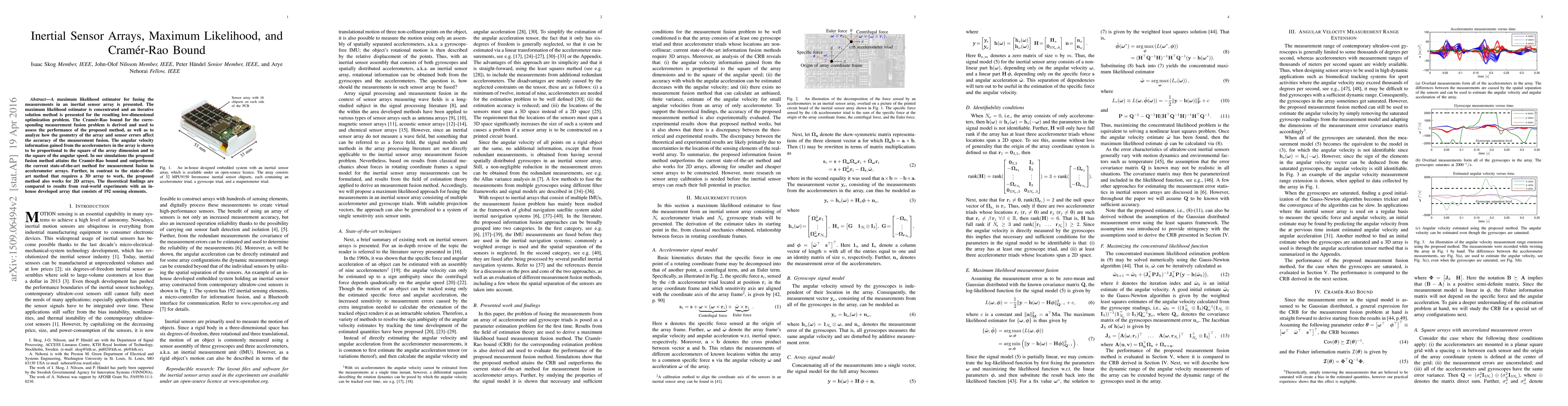 This paper presents a maximum likelihood estimator for fusing measurements in inertial sensor arrays, achieving performance close to the Cram\'er-Rao bound. It outperforms existing methods and works for both 2D and 3D arrays, validated through simulations and real-world experiments with a 192-element array.