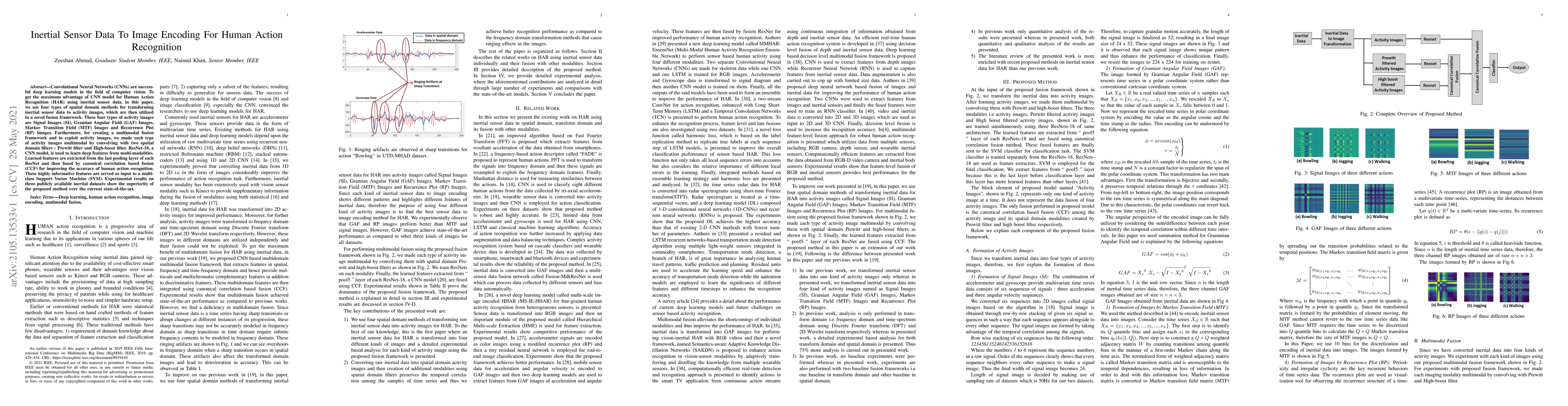 This paper proposes a novel framework for Human Action Recognition using inertial sensor data, transforming it into various types of activity images (SI, GAF, MTF, RP) and enhancing them with spatial filters. A ResNet-18 CNN model extracts deep features from these multimodal images, which are fused using canonical correlation analysis and input to a SVM for classification, outperforming existing methods.