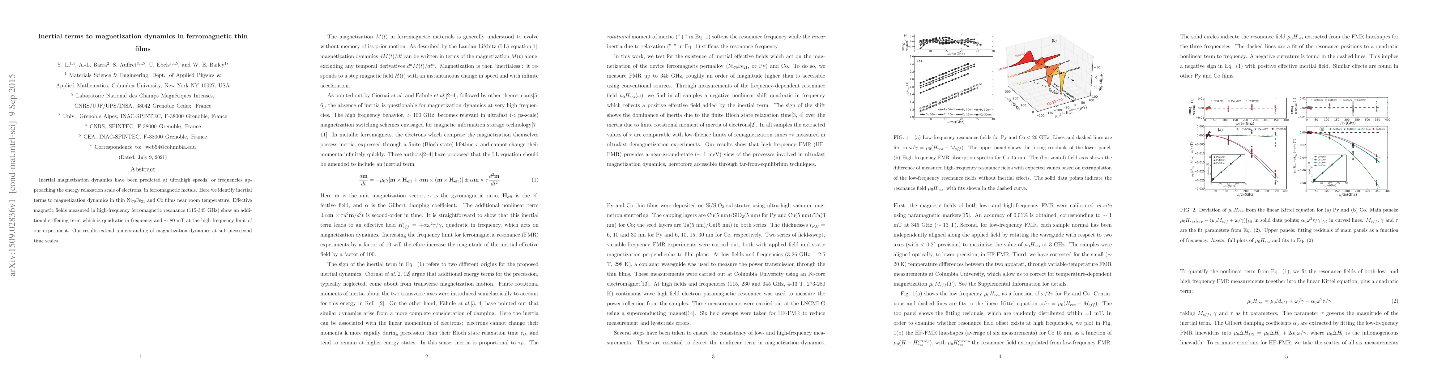 This study identifies inertial terms in magnetization dynamics in ferromagnetic thin films of Ni$_{79}$Fe$_{21}$ and Co at room temperature, revealing an additional stiffening magnetic field quadratic in frequency, extending the understanding of magnetization dynamics at sub-picosecond time scales.