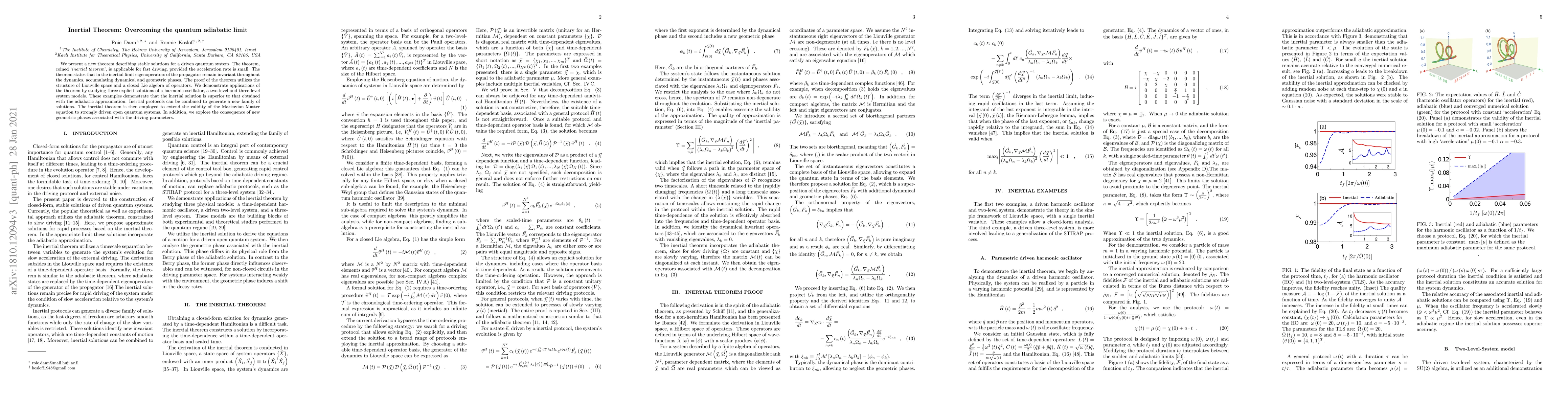 We present a new theorem describing stable solutions for a driven quantum system. The theorem, coined `inertial theorem', is applicable for fast driving, provided the acceleration rate is small. The theorem states that in the inertial limit eigenoperators of the propagator remain invariant throughout the dynamics, accumulating dynamical and geometric phases. The proof of the theorem utilizes the structure of Liouville space and a closed Lie algebra of operators. We demonstrate applications of the theorem by studying three explicit solutions of a harmonic oscillator, a two-level and three-level system models. These examples demonstrate that the inertial solution is superior to that obtained with the adiabatic approximation. Inertial protocols can be combined to generate a new family of solutions. The inertial theorem is then employed to extend the validity of the Markovian Master equation to strongly driven open quantum systems. In addition, we explore the consequence of new geometric phases associated with the driving parameters.