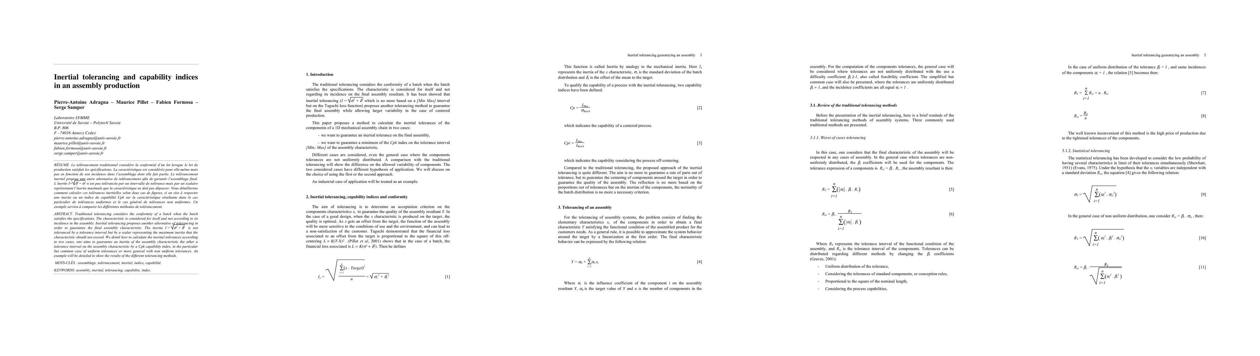 Traditional tolerancing considers the conformity of a batch when the batch satisfies the specifications. The characteristic is considered for itself and not according to its incidence in the assembly. Inertial tolerancing proposes another alternative of tolerancing in order to guarantee the final assembly characteristic. The inertia I2 = \sqrt{\delta^2 + \sigma^2} is not toleranced by a tolerance interval but by a scalar representing the maximum inertia that the characteristic should not exceed. We detail how to calculate the inertial tolerances according to two cases, one aims to guarantee an inertia of the assembly characteristic the other a tolerance interval on the assembly characteristic by a Cpk capability index, in the particular but common case of uniform tolerances or more general with non uniform tolerances. An example will be detailed to show the results of the different tolerancing methods.