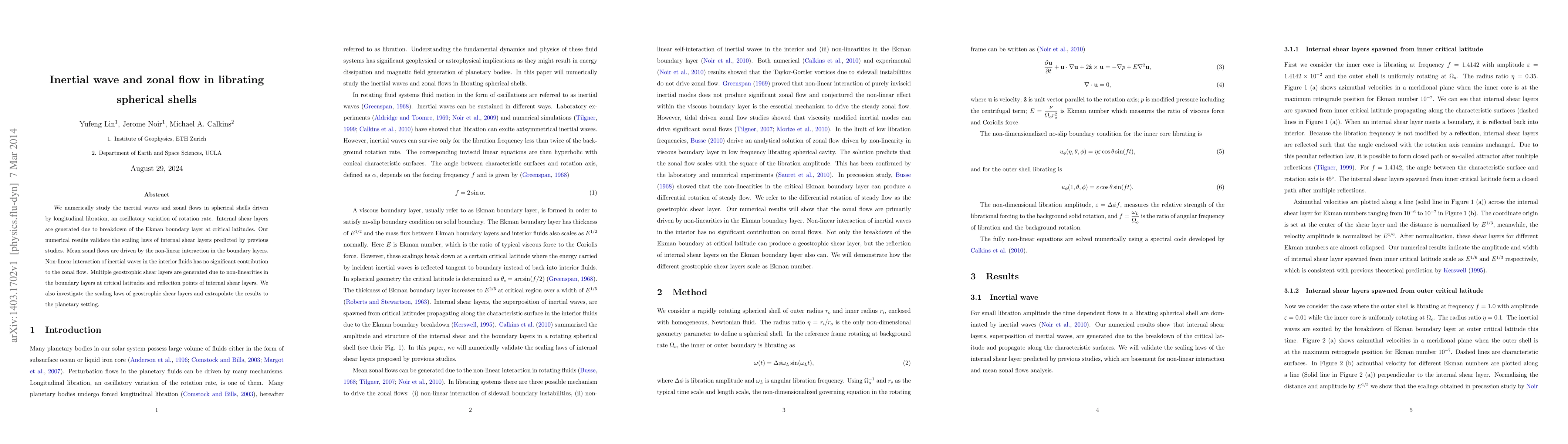 The research numerically studies inertial waves and zonal flows in spherical shells driven by libration, an oscillatory variation of rotation rate.
