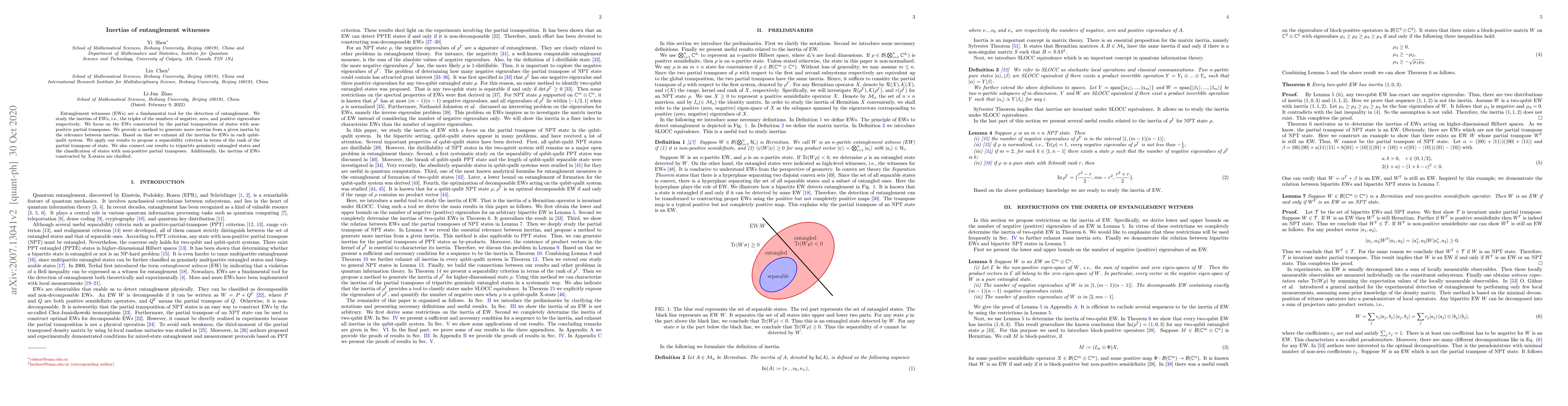 Entanglement witnesses (EWs) are a fundamental tool for the detection of entanglement. We study the inertias of EWs, i.e., the triplet of the numbers of negative, zero, and positive eigenvalues respectively. We focus on the EWs constructed by the partial transposition of states with non-positive partial transposes. We provide a method to generate more inertias from a given inertia by the relevance between inertias. Based on that we exhaust all the inertias for EWs in each qubit-qudit system. We apply our results to propose a separability criterion in terms of the rank of the partial transpose of state. We also connect our results to tripartite genuinely entangled states and the classification of states with non-positive partial transposes. Additionally, the inertias of EWs constructed by X-states are clarified.