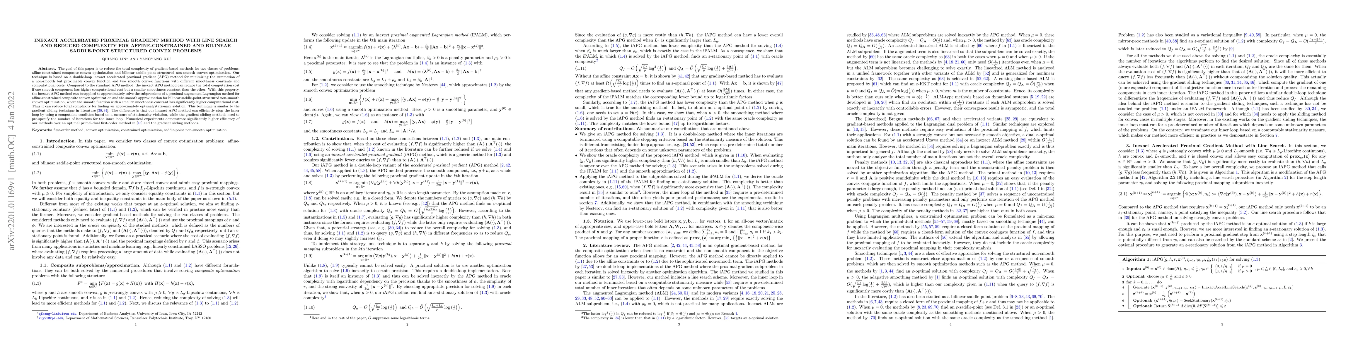 This paper proposes an inexact accelerated proximal gradient method with line search to reduce the complexity of solving affine-constrained composite convex and bilinear saddle-point structured non-smooth convex optimization problems. The method efficiently stops the inner loop based on stationarity, leading to significant computational savings compared to standard methods and gradient sliding techniques.