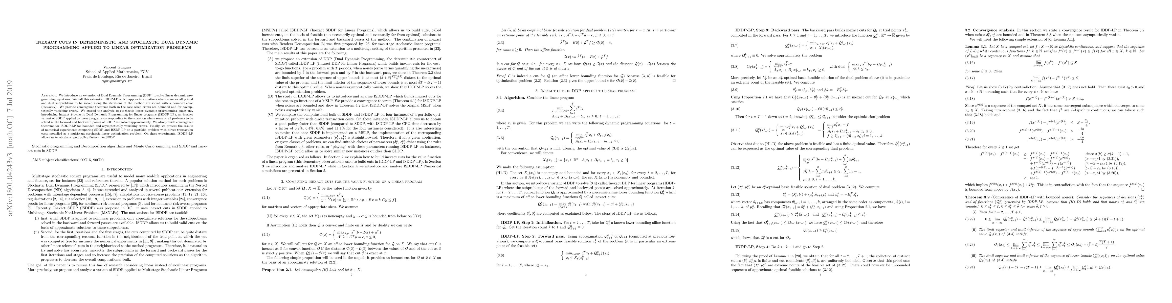 This paper extends Dual Dynamic Programming (DDP) to handle inexact solutions in linear dynamic programming, introducing IDDP-LP, and extends this to stochastic settings with ISDDP-LP. It provides convergence theorems for both methods under bounded and vanishing error conditions, and demonstrates faster policy convergence in numerical experiments.