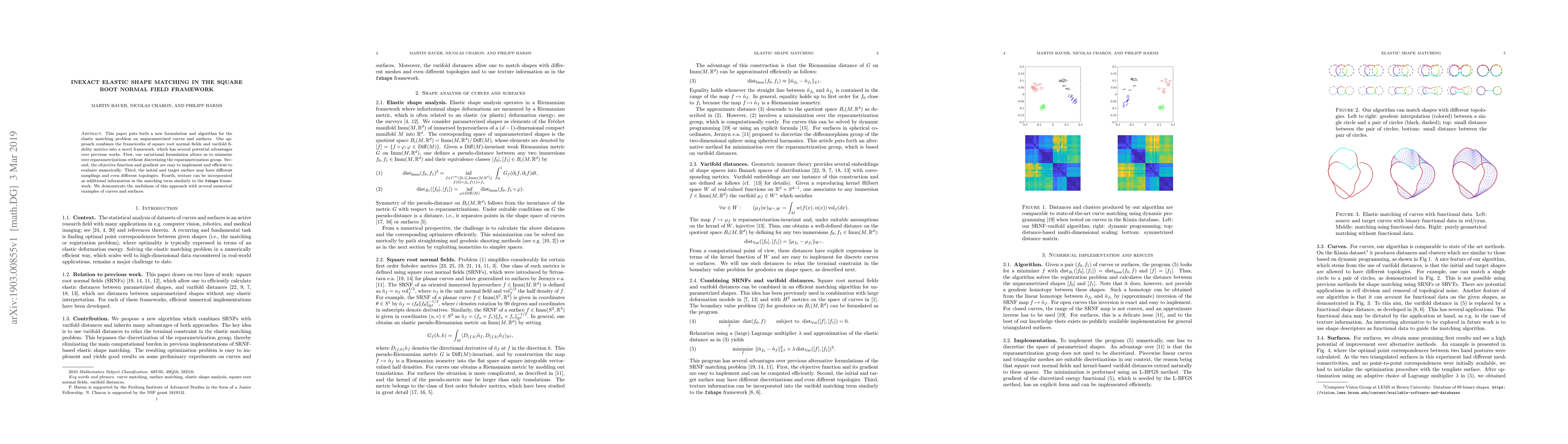 This paper puts forth a new formulation and algorithm for the elastic matching problem on unparametrized curves and surfaces. Our approach combines the frameworks of square root normal fields and varifold fidelity metrics into a novel framework, which has several potential advantages over previous works. First, our variational formulation allows us to minimize over reparametrizations without discretizing the reparametrization group. Second, the objective function and gradient are easy to implement and efficient to evaluate numerically. Third, the initial and target surface may have different samplings and even different topologies. Fourth, texture can be incorporated as additional information in the matching term similarly to the fshape framework. We demonstrate the usefulness of this approach with several numerical examples of curves and surfaces.