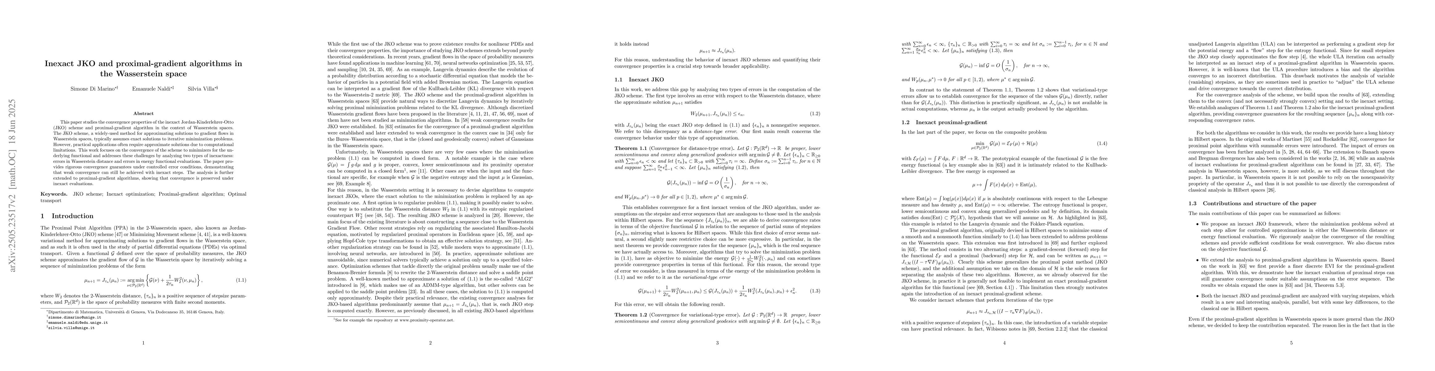 The paper introduces inexact JKO schemes and proximal-gradient algorithms in Wasserstein spaces, providing convergence guarantees under controlled error conditions.