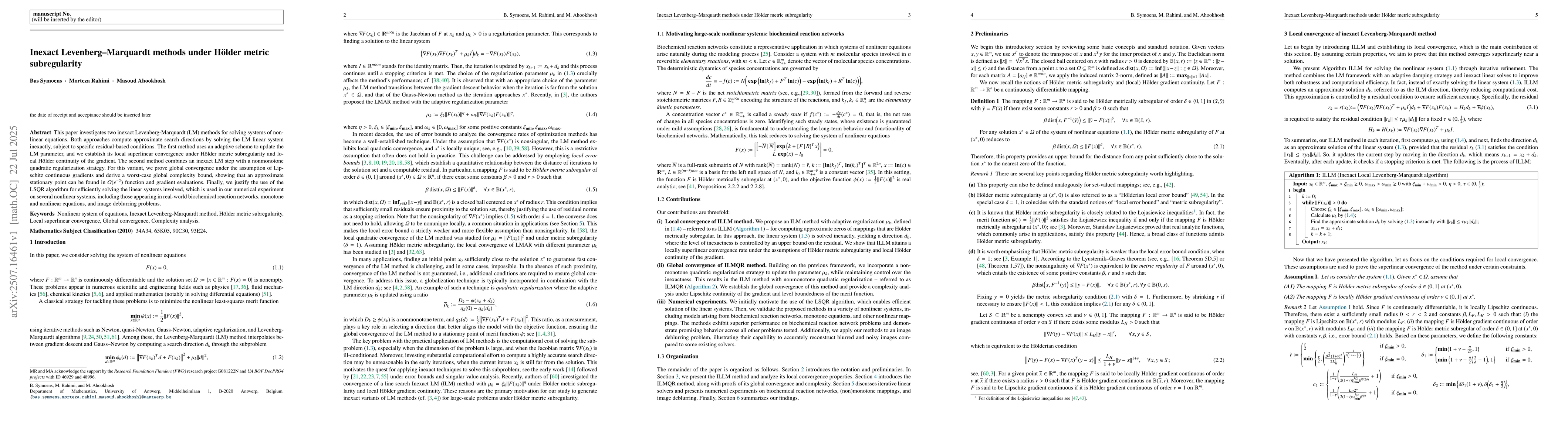 This paper investigates two inexact Levenberg-Marquardt (LM) methods for solving systems of nonlinear equations. Both approaches compute approximate search directions by solving the LM linear system inexactly, subject to specific residual-based conditions. The first method uses an adaptive scheme to update the LM parameter, and we establish its local superlinear convergence under H\"older metric subregularity and local H\"older continuity of the gradient. The second method combines an inexact LM step with a nonmonotone quadratic regularization strategy. For this variant, we prove global convergence under the assumption of Lipschitz continuous gradients and derive a worst-case global complexity bound, showing that an approximate stationary point can be found in $\mathcal{O}(\epsilon^{-2})$ function and gradient evaluations. Finally, we justify the use of the LSQR algorithm for efficiently solving the linear systems involved, which is used in our numerical experiment on several nonlinear systems, including those appearing in real-world biochemical reaction networks, monotone and nonlinear equations, and image deblurring problems.