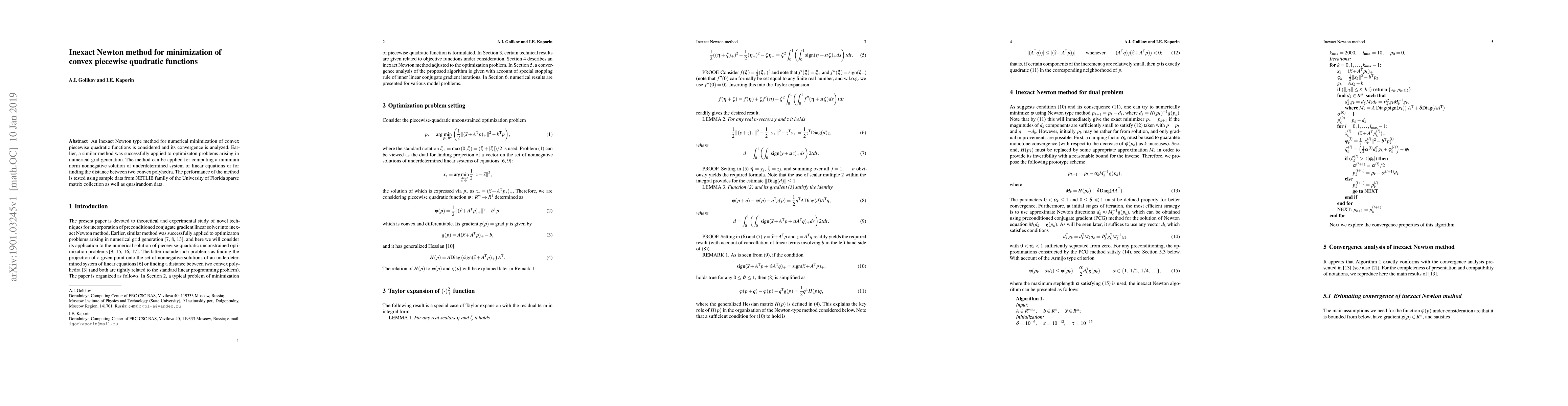An inexact Newton type method for numerical minimization of convex piecewise quadratic functions is considered and its convergence is analyzed. Earlier, a similar method was successfully applied to optimizaton problems arising in numerical grid generation. The method can be applied for computing a minimum norm nonnegative solution of underdetermined system of linear equations or for finding the distance between two convex polyhedra. The performance of the method is tested using sample data from NETLIB family of the University of Florida sparse matrix collection as well as quasirandom data.