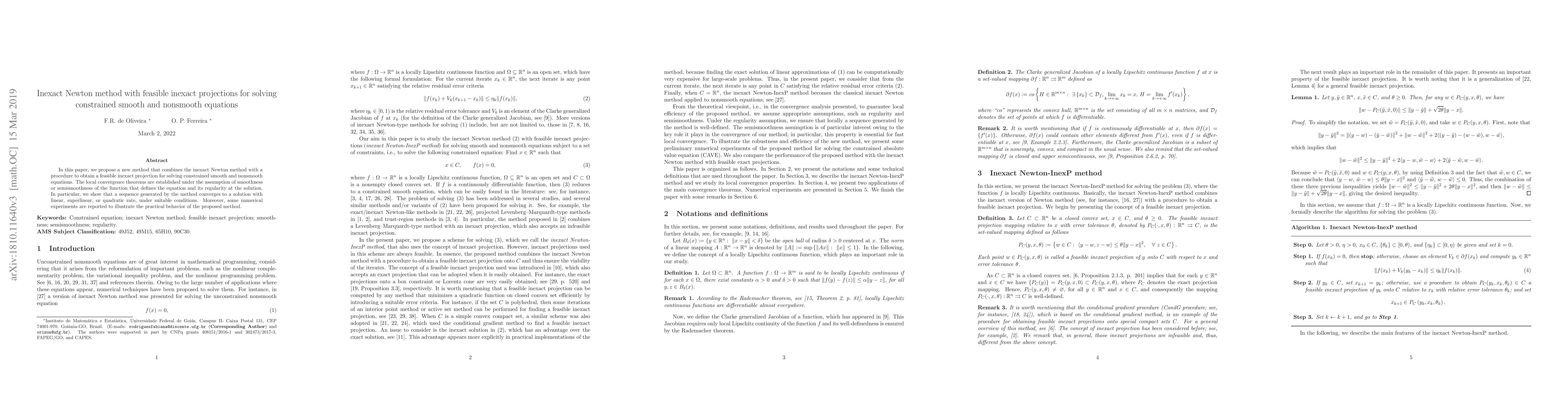 This paper introduces a novel method combining the inexact Newton method with feasible inexact projections for solving constrained smooth and nonsmooth equations. It establishes local convergence theorems under smoothness or semismoothness assumptions and demonstrates linear, superlinear, or quadratic convergence rates, supported by numerical experiments.