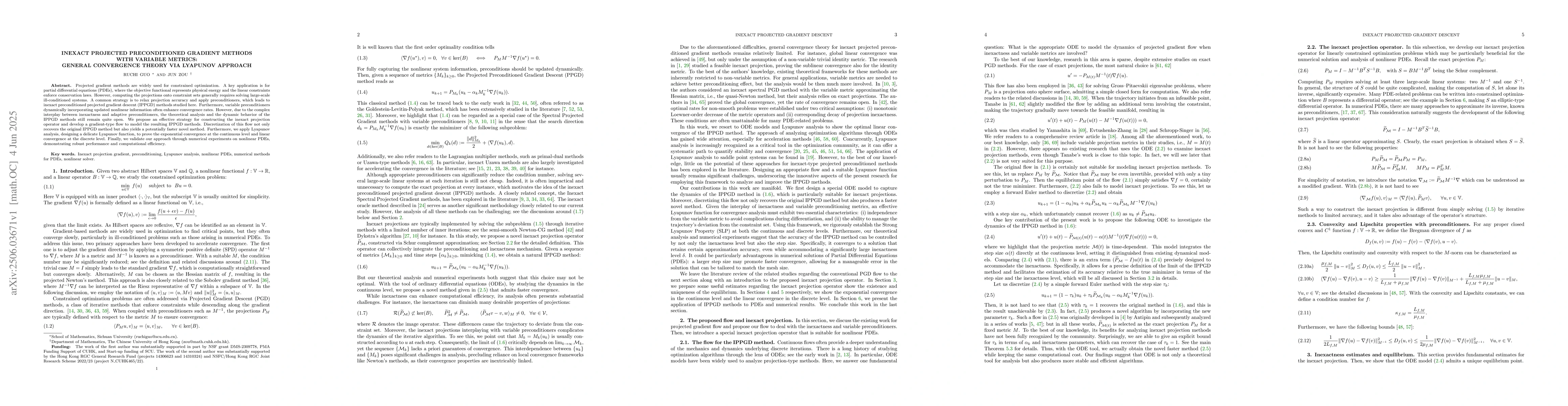 This paper introduces inexact preconditioned projected gradient methods for constrained optimization, particularly for PDEs. It proposes a strategy for constructing inexact projection operators, develops a gradient-type flow, and uses Lyapunov analysis to prove convergence. The method is applied to nonlinear PDEs with promising numerical results.