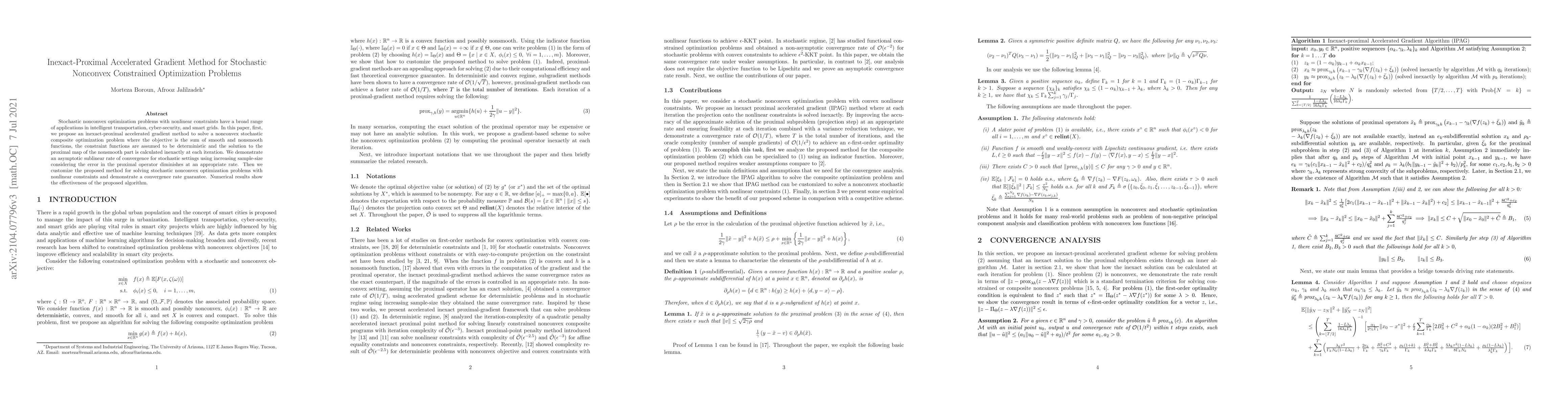 Stochastic nonconvex optimization problems with nonlinear constraints have a broad range of applications in intelligent transportation, cyber-security, and smart grids. In this paper, first, we propose an inexact-proximal accelerated gradient method to solve a nonconvex stochastic composite optimization problem where the objective is the sum of smooth and nonsmooth functions, the constraint functions are assumed to be deterministic and the solution to the proximal map of the nonsmooth part is calculated inexactly at each iteration. We demonstrate an asymptotic sublinear rate of convergence for stochastic settings using increasing sample-size considering the error in the proximal operator diminishes at an appropriate rate. Then we customize the proposed method for solving stochastic nonconvex optimization problems with nonlinear constraints and demonstrate a convergence rate guarantee. Numerical results show the effectiveness of the proposed algorithm.