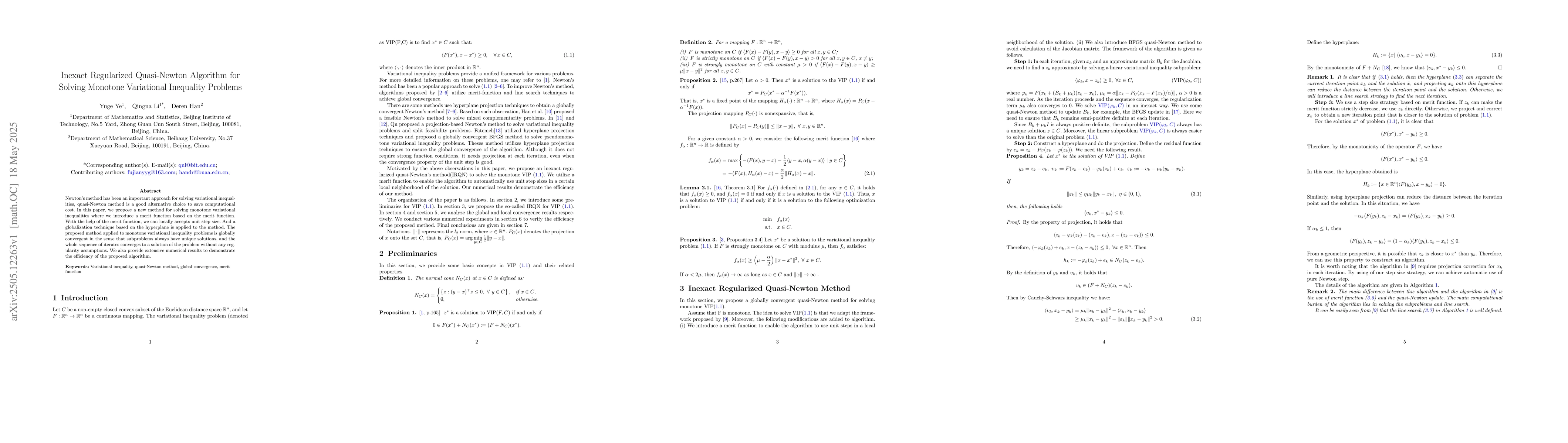 The paper proposes an inexact regularized quasi-Newton algorithm for solving monotone variational inequality problems, introducing a merit function and a globalization technique based on hyperplanes.
