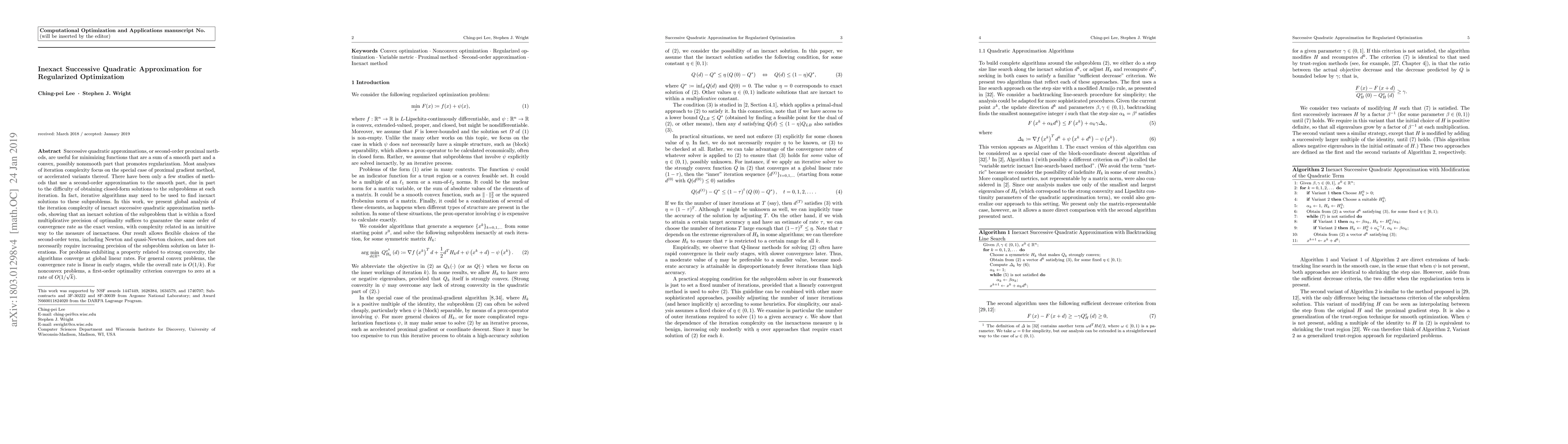 Successive quadratic approximations, or second-order proximal methods, are useful for minimizing functions that are a sum of a smooth part and a convex, possibly nonsmooth part that promotes regularization. Most analyses of iteration complexity focus on the special case of proximal gradient method, or accelerated variants thereof. There have been only a few studies of methods that use a second-order approximation to the smooth part, due in part to the difficulty of obtaining closed-form solutions to the subproblems at each iteration. In fact, iterative algorithms may need to be used to find inexact solutions to these subproblems. In this work, we present global analysis of the iteration complexity of inexact successive quadratic approximation methods, showing that an inexact solution of the subproblem that is within a fixed multiplicative precision of optimality suffices to guarantee the same order of convergence rate as the exact version, with complexity related in an intuitive way to the measure of inexactness. Our result allows flexible choices of the second-order term, including Newton and quasi-Newton choices, and does not necessarily require increasing precision of the subproblem solution on later iterations. For problems exhibiting a property related to strong convexity, the algorithms converge at global linear rates. For general convex problems, the convergence rate is linear in early stages, while the overall rate is $O(1/k)$. For nonconvex problems, a first-order optimality criterion converges to zero at a rate of $O(1/\sqrt{k})$.